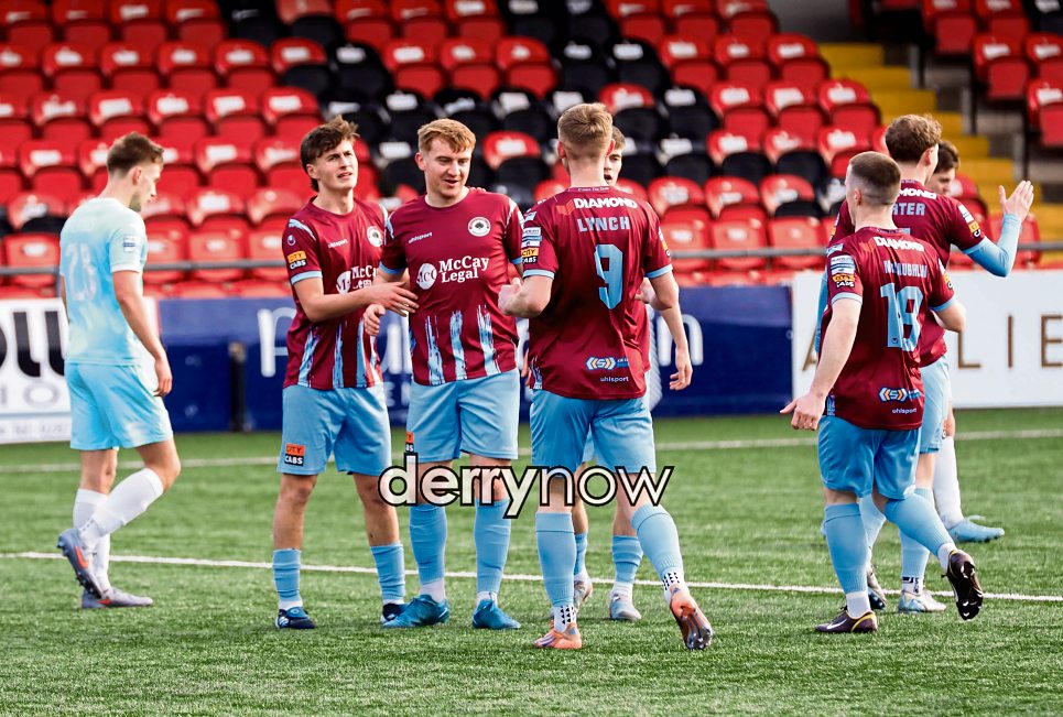 Institute’s Stephen Doherty celebrating his goal with teammates.