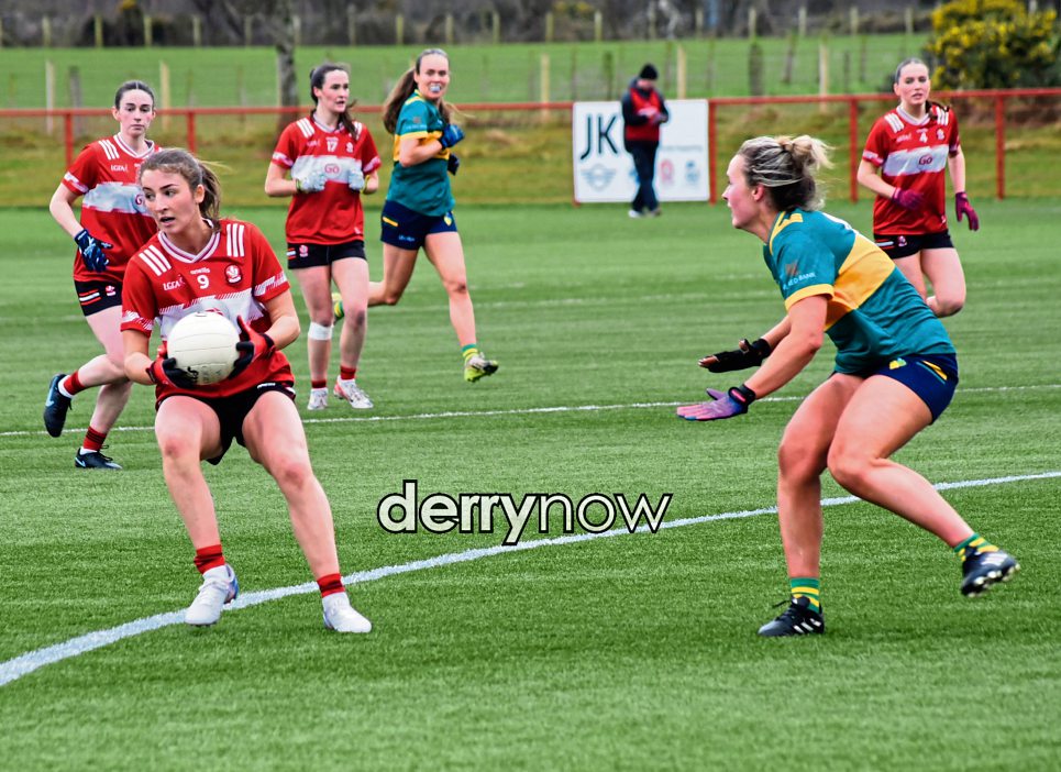 Derry's Sarah Heron looks to offload the ball at Owenbeg on Sunday.