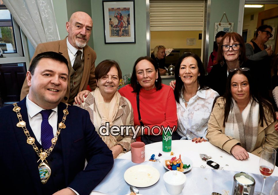 Mayor Ruairi McHugh with, guests, John, Lynn, Moira, Angela and Caroline at the celebration lunch to mark the 25th anniversary of Foyle Valley House.