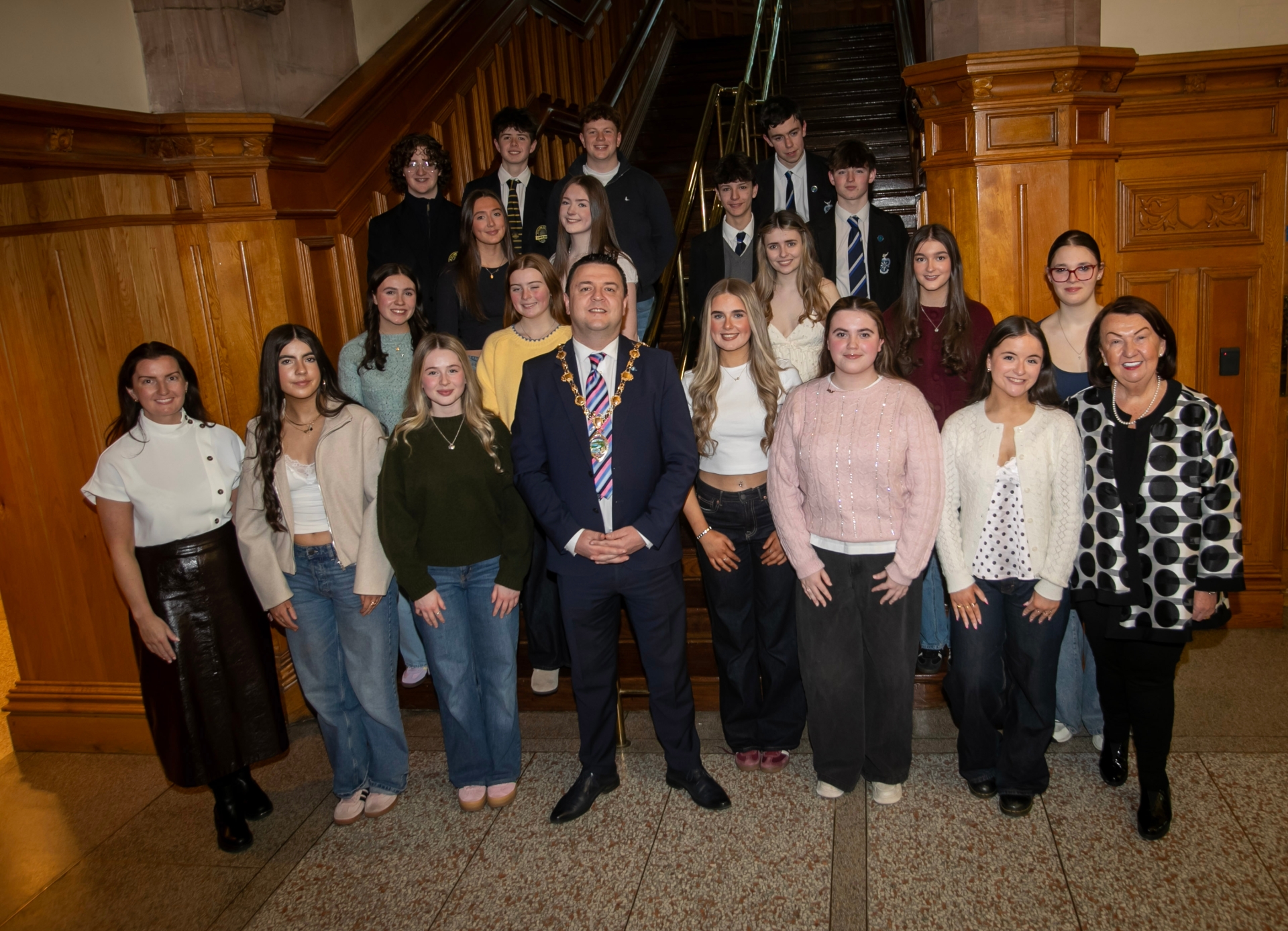 Grade 8 pupils from the Foyle School of Speech and Drama pictured with teachers Sandra and Blathnaid Biddle alongside the Mayor of Derry City and Strabane District Council, Ruairi McHugh.