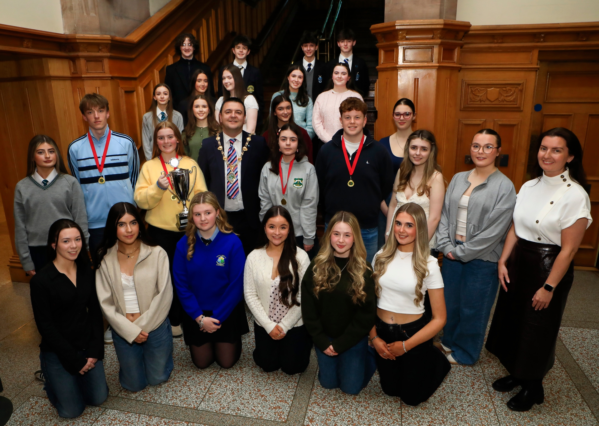 Mayor Ruairí McHugh with Foyle School of Speech and Drama pupils awarded the Perpetual Cup for Best Endeavour, presented by Mercy Global Concern at the United Nations. Included on right, Blathnaid Biddle.