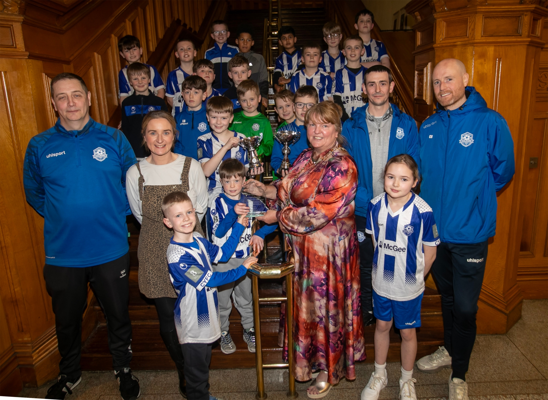 The. Deputy Mayor, Niree McMorris pictured with the 2016 combined teams of Culmore Youths FC and their coaches on Tuesday evening at the Guildhall, Derry.
