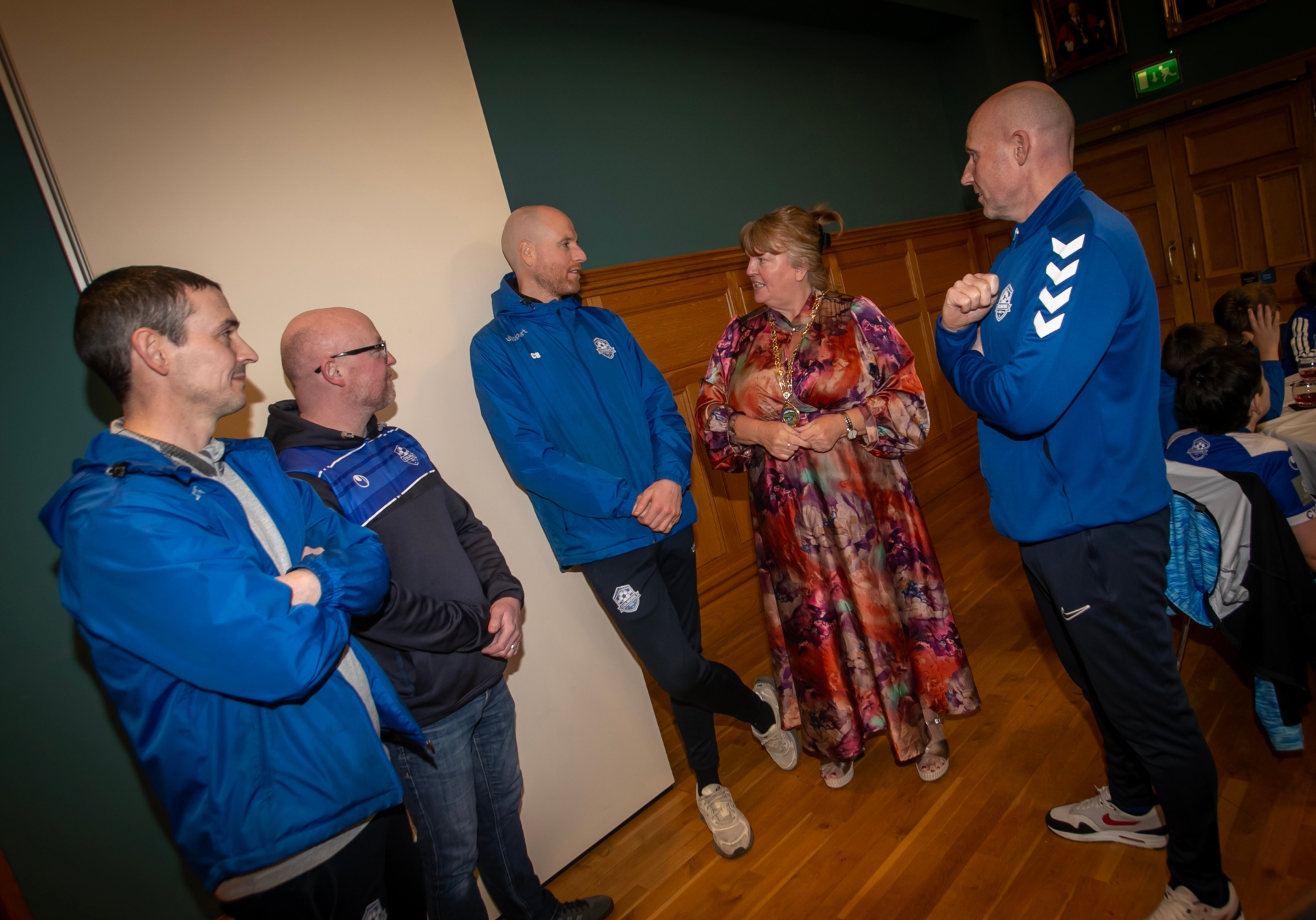 The Deputy Mayor Niree McMorris pictured chatting to some of the Culmore Youths FC coaches at Tuesday night's reception in the Guildhall.