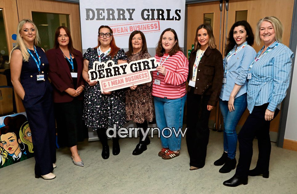 Event organisers and speakers at the Enterprise North West International Women’s Day event “Derry Girls Mean Business” held in the StudentZone, North-West Regional College. From left, are Louise O’Donnell, NWRC, Siobhan Faulkner, NWRC, Victoria Killeen, Enterprise NW, Annemarie Slavin, Modern Democracy, Katie McConnell, Yum Cakes, Rachel Gallagher, Nomads Jewellery, Louise Da Costa, Da Costa Records, and Sandra Wylie, Enterprise NW. (Photos - Tom Heaney, nwpresspics)
