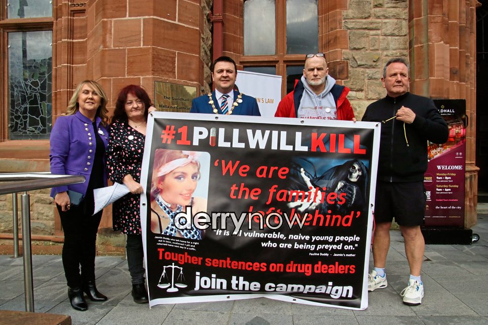 Mayor Ruairí McHugh with William Burns, campaigner “1 Pill Will Kill” Gary Lenaghan, and on right, Ciara Ferguson, MLA, and Pauline Duffy (speaker) at the Anti-drugs rally, Guildhall. (Photos - Deirdre Heaney, nwpresspics)