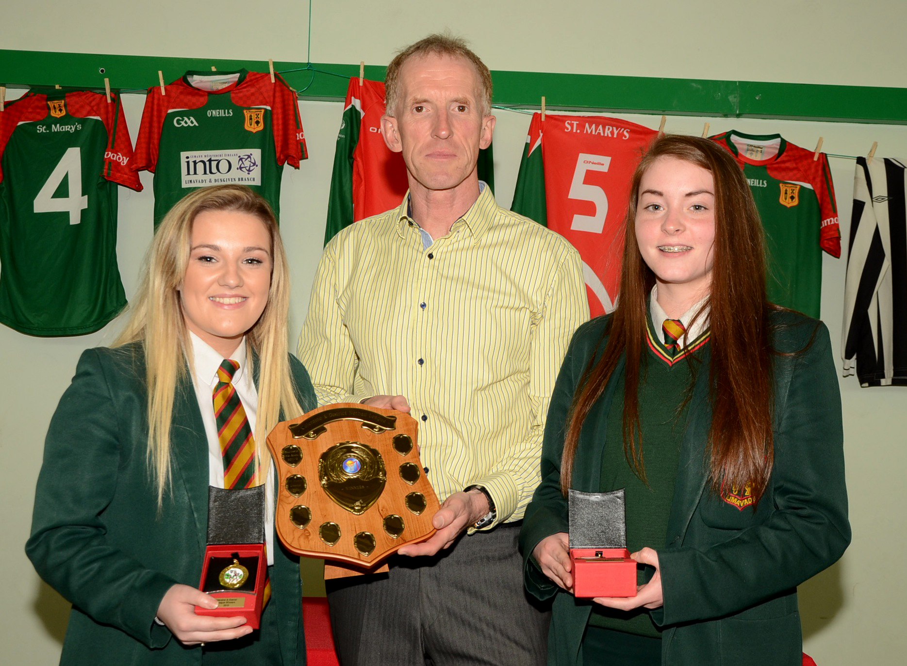 Netball captains Kelly Logue and Megan Gormely with guest Peter Jack