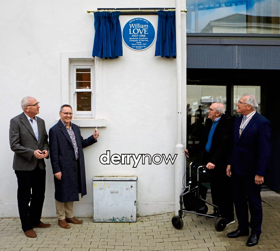 Leslie Porter, son-in-law and Steve Porter (grandson) unveiling the Blue Plaque in memory of local band tune composer, William Love, who died in 1966, at New Gate Arts and Culture Centre Centre, Kennedy Place, Fountain, on Monday. Included on left, is Brian Dougherty, North West Cultural Partnership, and on right, Lord Lieutenant Ian Crowe.