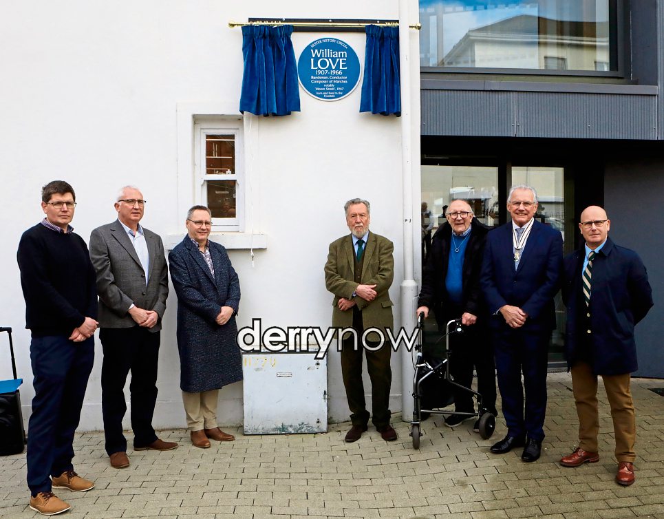 Chris Spurr, chairman, Ulster History Circle, with on right, Leslie Porter, son-in-law and on left, Steve Porter (grandson) after the unveiling the Blue Plaque in memory of local band tune composer, William Love, who died in 1966, at New Gate Arts and Culture Centre Centre, Kennedy Place, Fountain, on Monday. Included on left, is Andrew Lynch, co-ordinator Londonderry Bands Forum, Brian Dougherty, North West Cultural Partnership, and on right, Brian Hughes and Lord Lieutenant Ian Crowe.