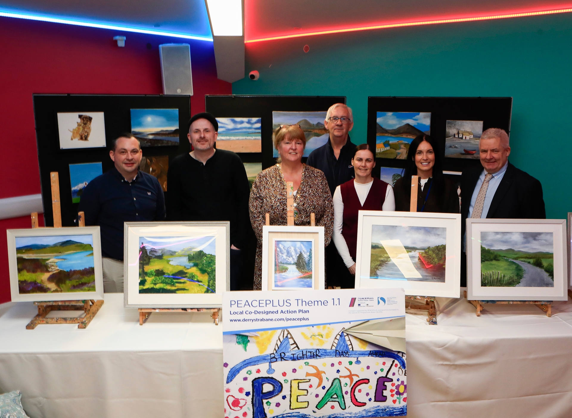 Deputy Mayor Niree McMorris at the Greater Shantallow Arts - “Art : Recovery to Discovery” project event held in Studio 2. From left, are Darren Milligan, Arts Council for NI, Tommy Long (art lecturer), and from right, Ollie Green, Studio 2, Shauna Ferry, event organiser, Fiona Lafferty, Peace II (funder), Martin Gallagher, Derry City & Strabane District Council.