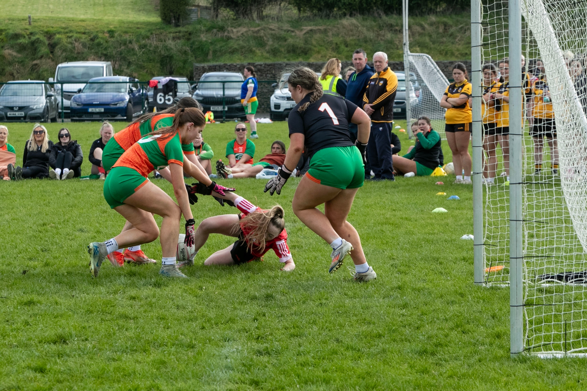 Goalmouth ction from Saturday's ladies football tournament at Burt between Sean Dolan's and Eire Ogs.