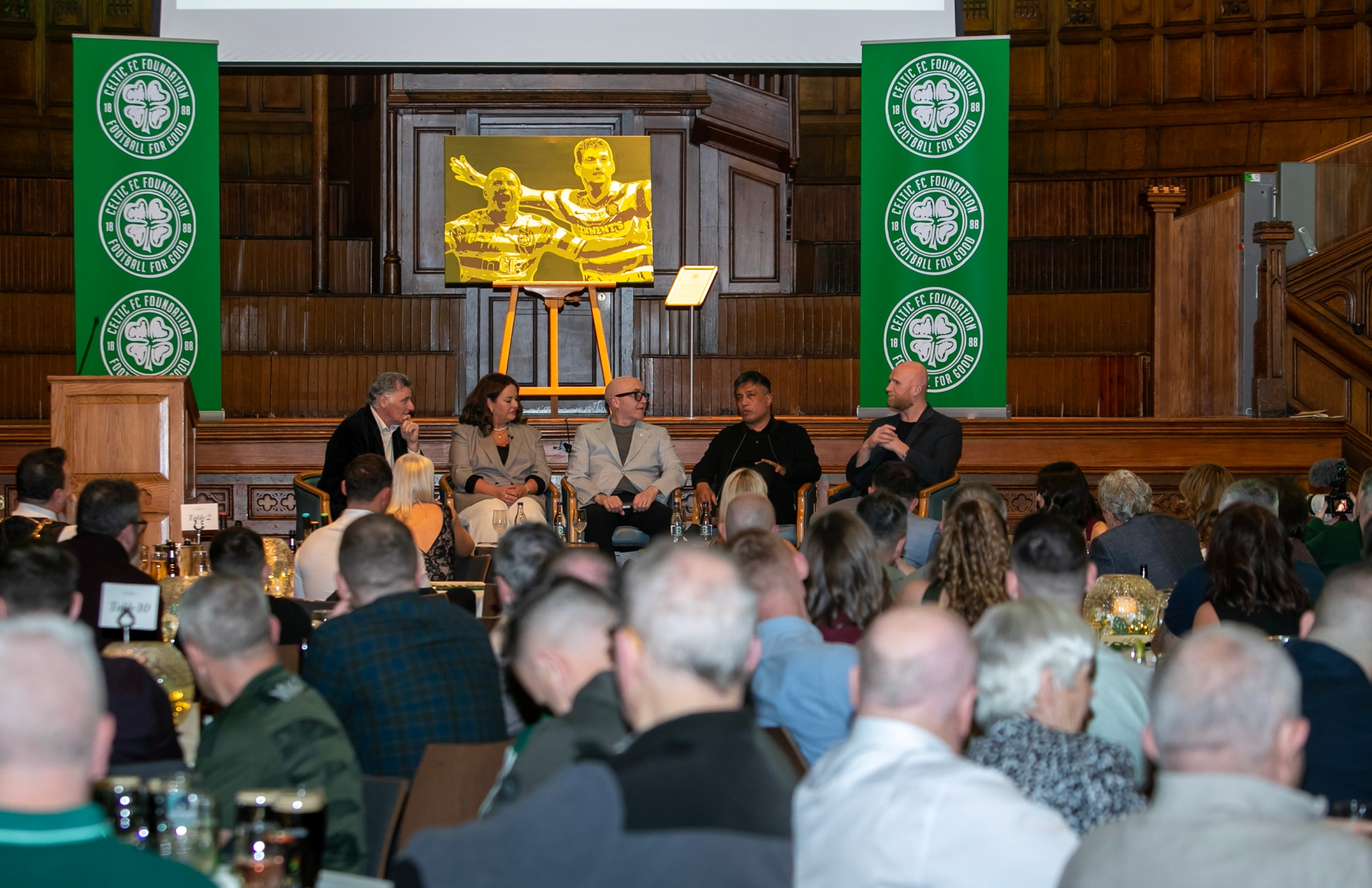 MC Felix Healy grills Celtic legends Bobby Petta and John Hartson on their careers during Thursday night's Celtic FC Foundation event in the Guildhall, Derry. (Photos: Jim McCafferty Photography)