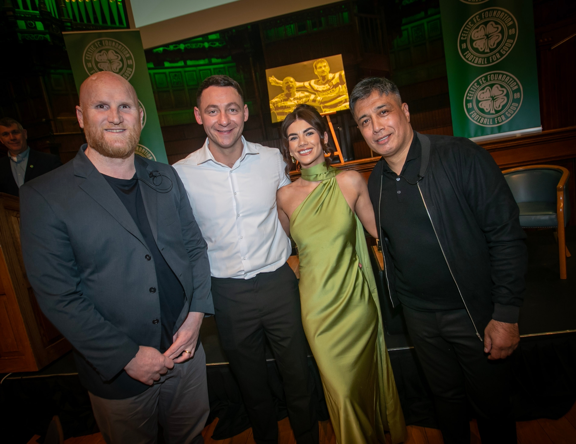 Celtic FC Foundation Derry representative and event organiser, Sean Thornton and his daughter pictured with Celtic stars John Hartson and Bobby Petta on Thursday night.