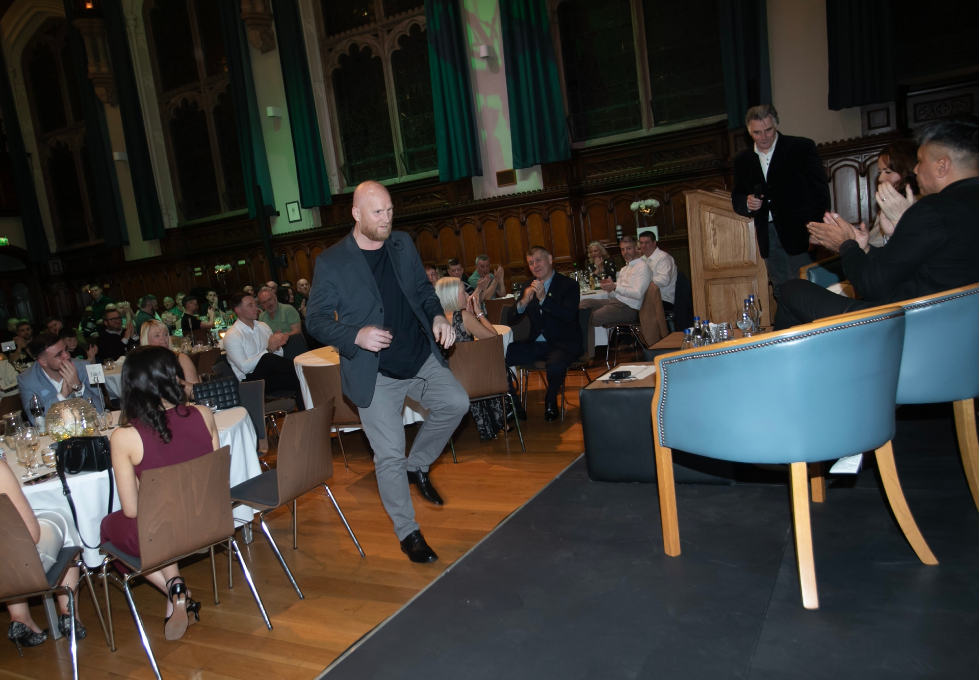 A rousing reception for Celtic legend John Hartson as he makes his way to the stage.