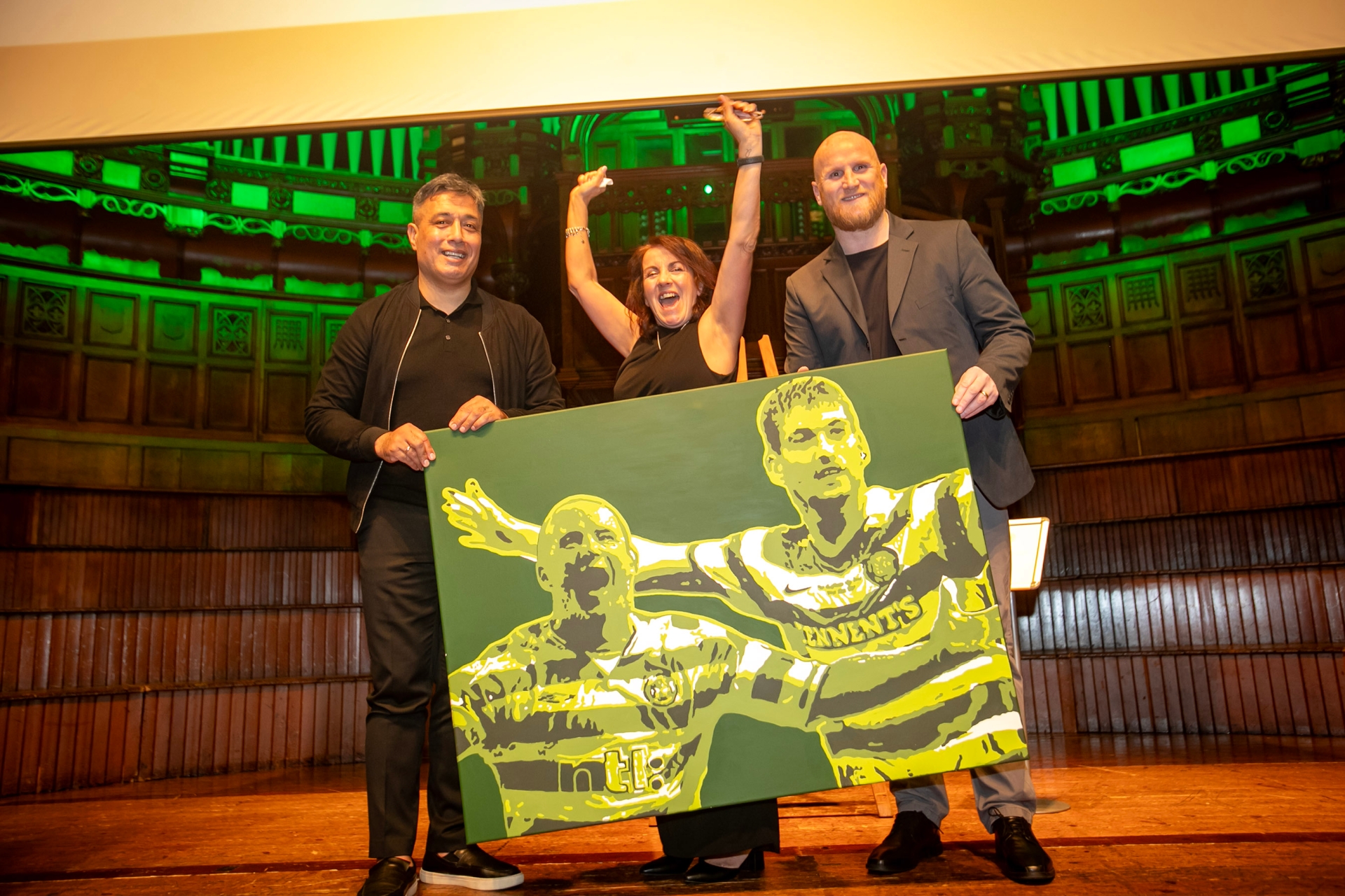 Celtic FC Foundation draw winner Monica Jarvis pictured on stage with Celtic legends Bobby Petta and John Hartson.