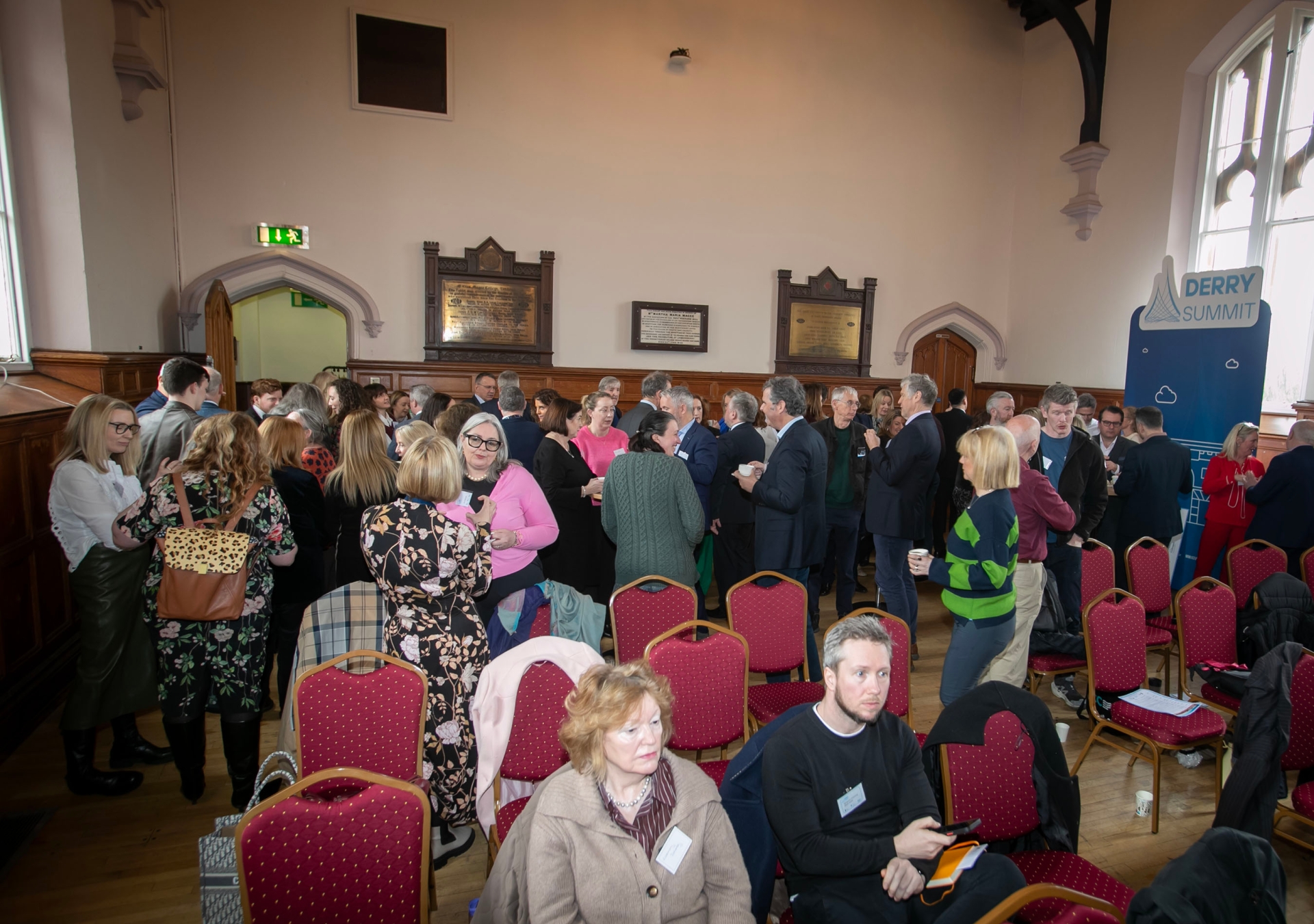 Delegates in conversation during a break at Thursday's Derry Summit 2026 held at the Great Hall, Magee, Derry.
