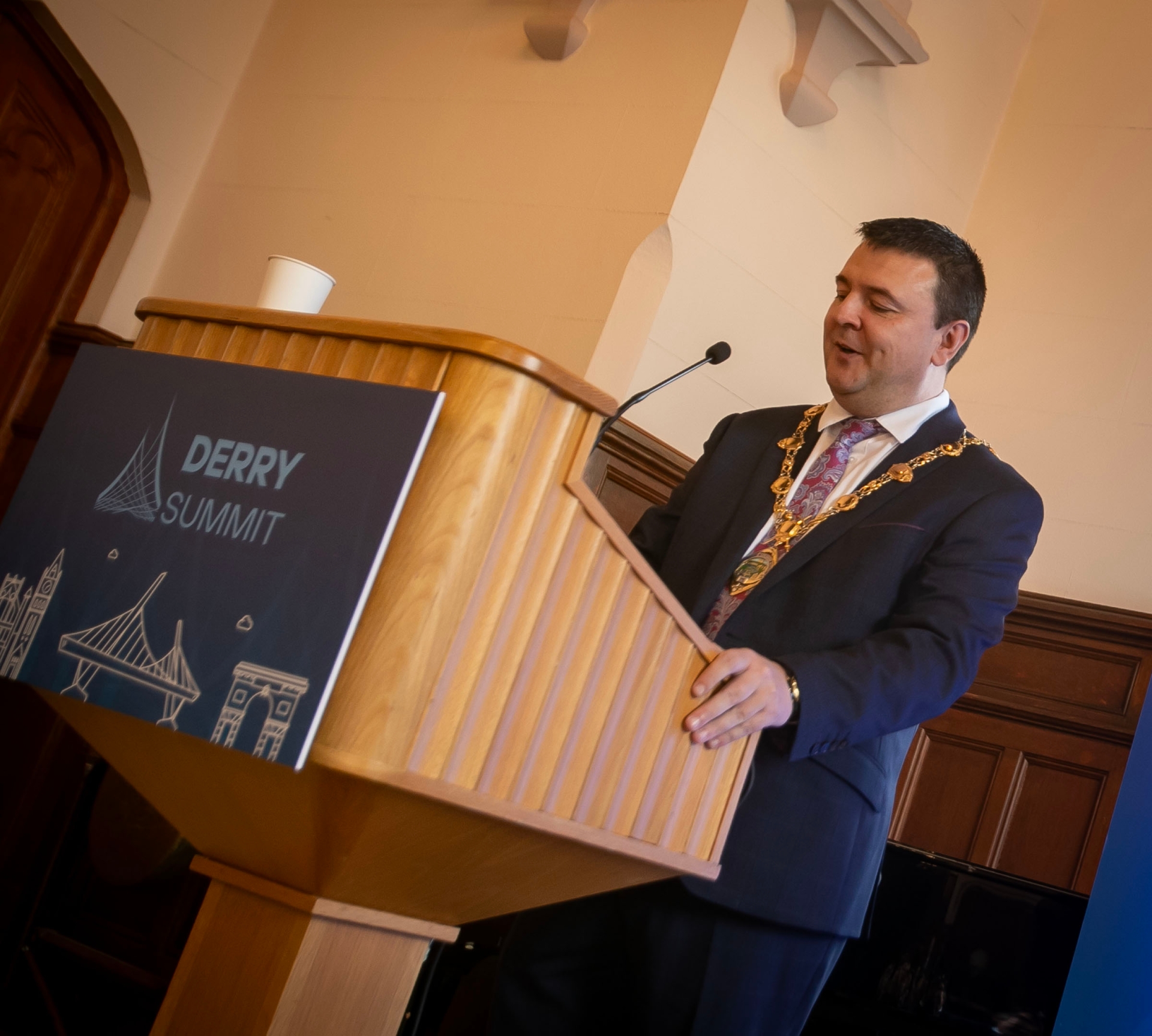 The Mayor of Derry City and Strabane District Council, Ruairi McHugh addressing the attendance at Thursday's Derry Summit 2026 at Ulster University Magee.