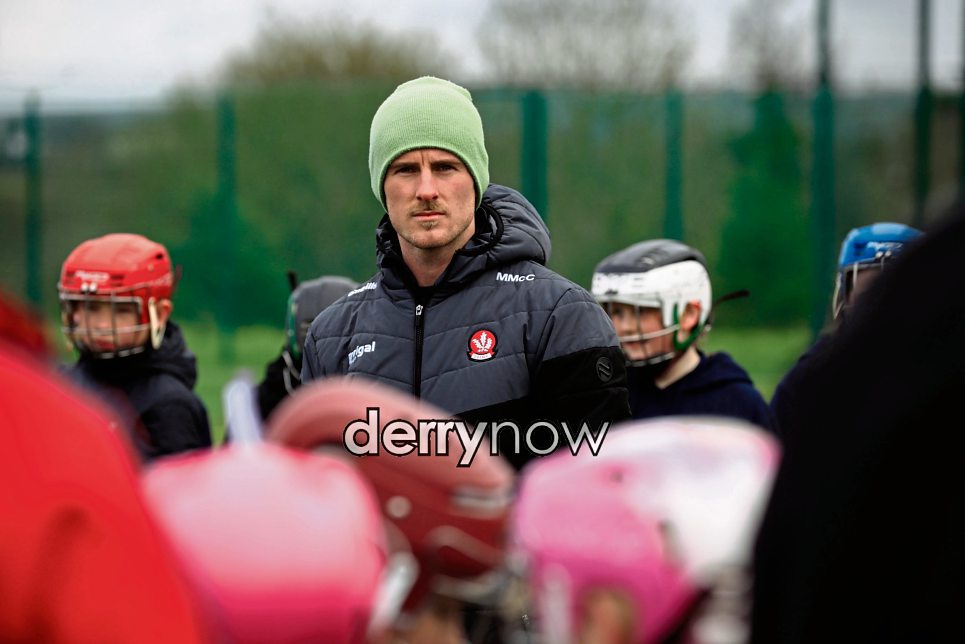 Mark McCloskey, Na Magha GPO, chatting to the teams at the start of the Cumman na Bunscoil Hurling Blitz Championship held in the Waterside Shared Village. (Photos - Tom Heaney, nwpresspics)