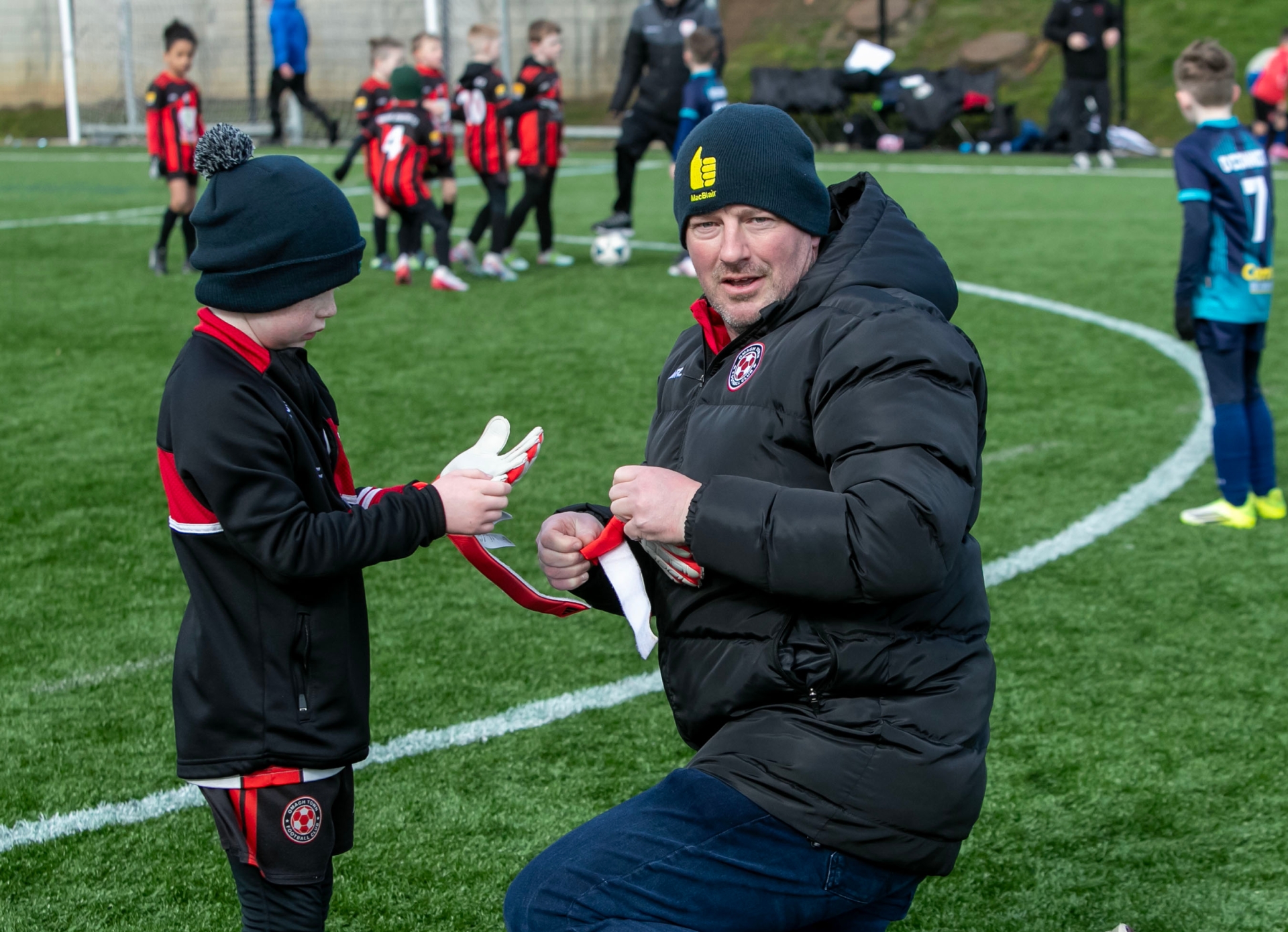 The Omagh Town keeper gets a new pair of gloves.