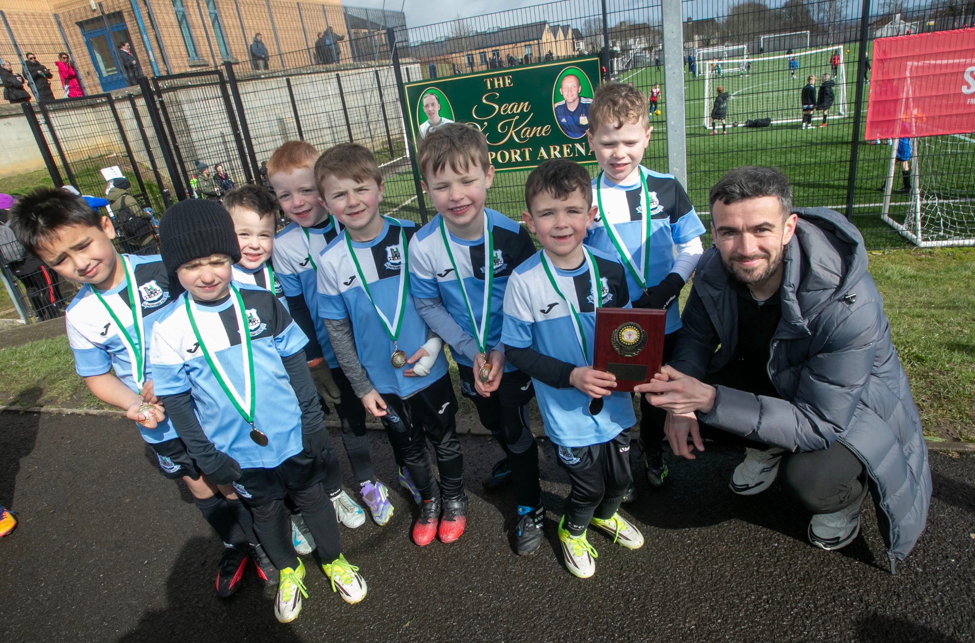 Derry City star Michael Duffy presenting the 2019s Shield to Kilmacrennan Celtic FC.