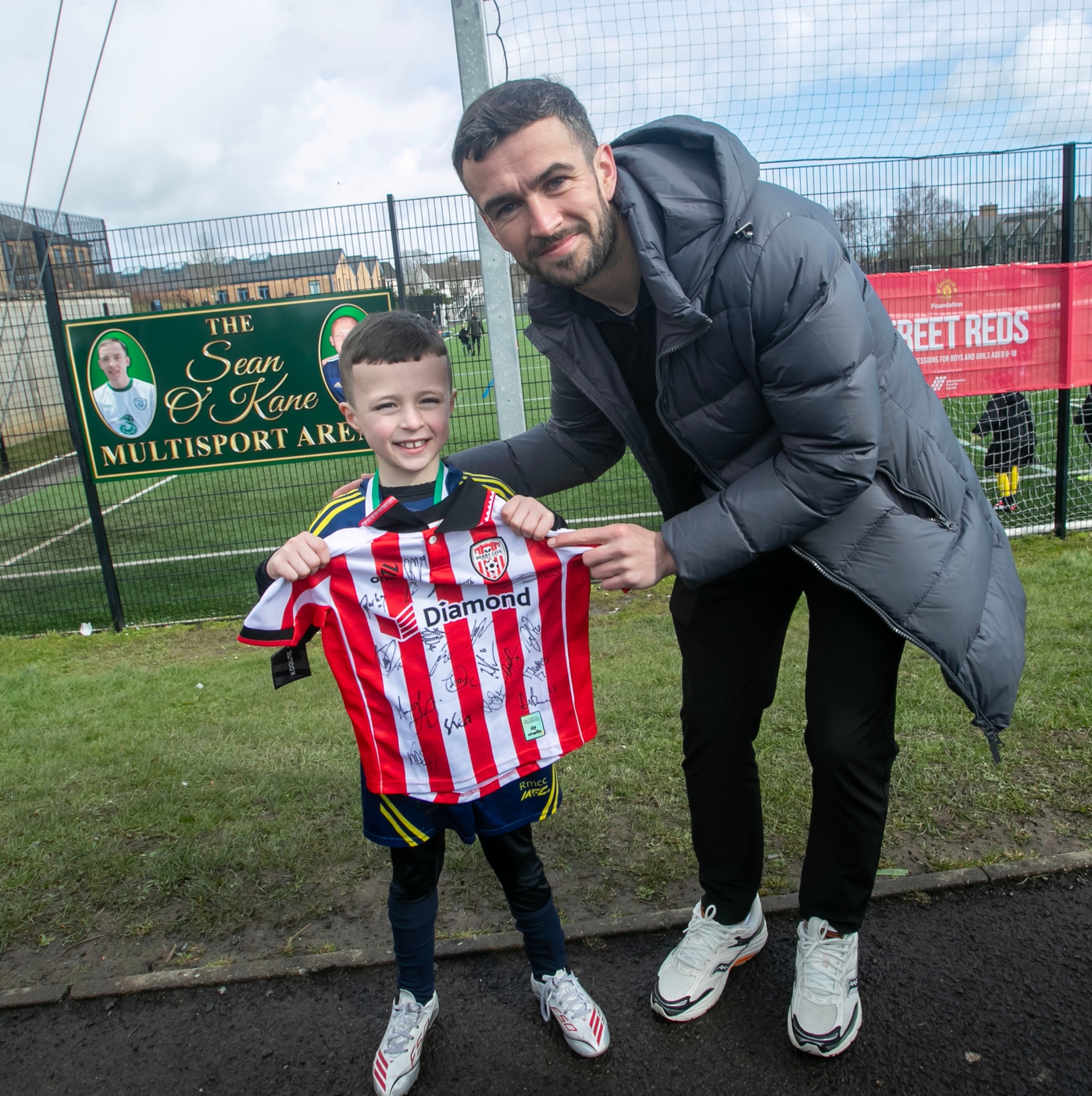 Derry City star Michael Duffy presents a signed Derry City shirt.