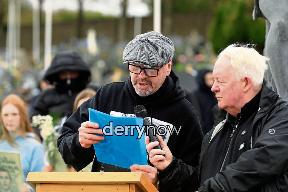 Belfast Republican Seamus Fitsimmons speaking at the Saoradh Easter Commemoration leaving Creggan Shop to City Cemetery.