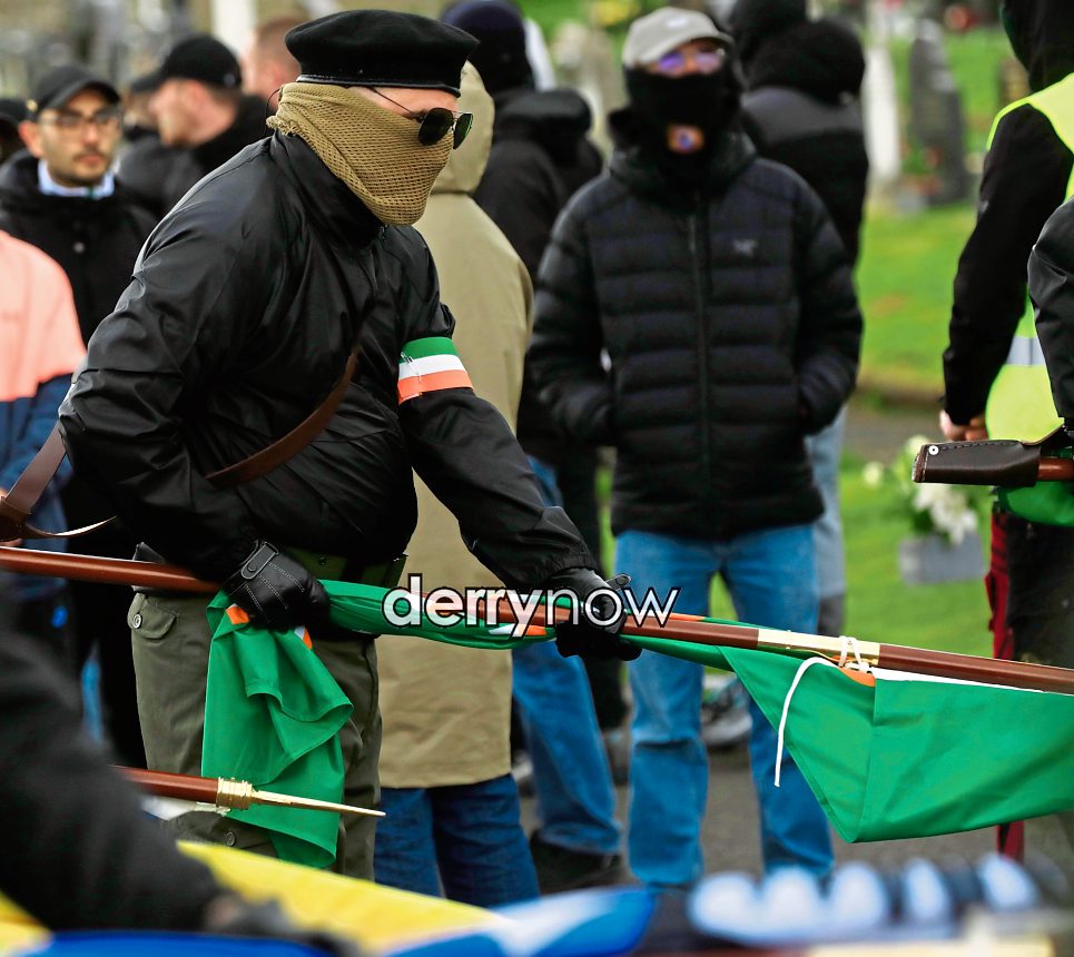 Members of the Colour Party lower the flags in salute to dead comrades at the Republican monument in the City Cemetery.