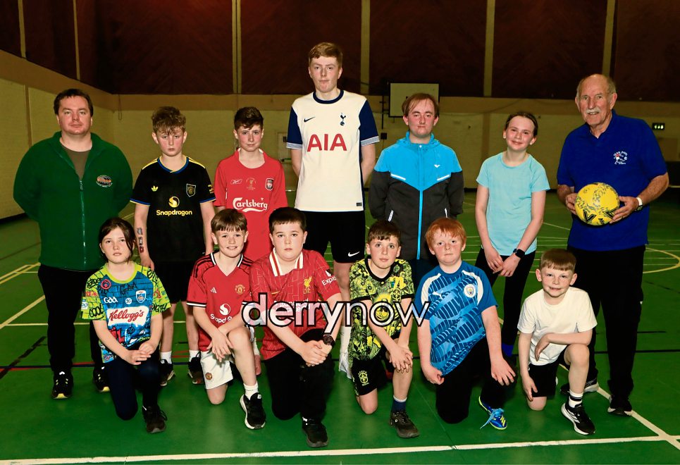 Group pictured at the Sean Davis Easter Soccer School held in Templemore Sports Complex. On right is Sean Davis, co-ordinator, and on left, Conal Harkin, coach. (Photo - Tom Heaney, nwpresspics)