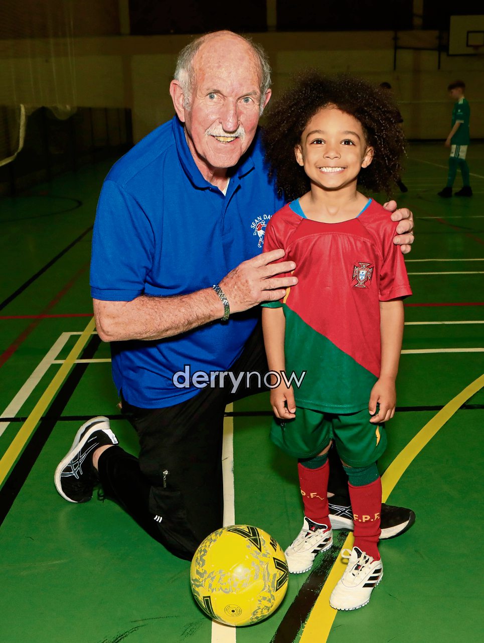 Sean Davis, co-ordinator, Sean Davis Easter Soccer School, with 5 year old J. J. McGilloway-Banda. (Photos - Tom Heaney, nwpresspics)