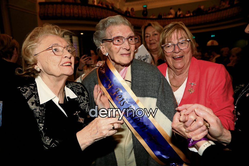 Former Irish dancer/teacher Pat Henderson Bond who presented a special sash to Lillian Moore, Irish Commission Dancing teacher celebrating her 100th year held on the final night of Feis Dhoire Cholmcille in St. Columb's Hall. On right Ursula Clifford, Feis committee chairperson.