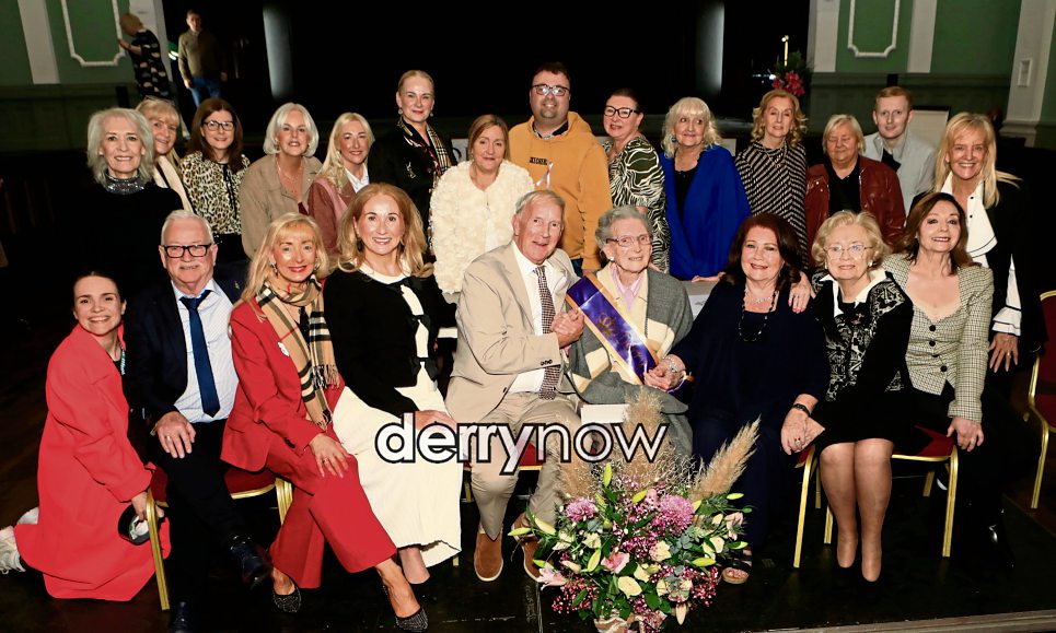 Brendan O'Brien with Irish dance teachers celebrate with Lillian Moore, Irish Commission Dancing teacher on her 100th year held on the final night of Feis Dhoire Cholmcille in St. Columb's Hall. (Photos - Tom Heaney, nwpresspics)