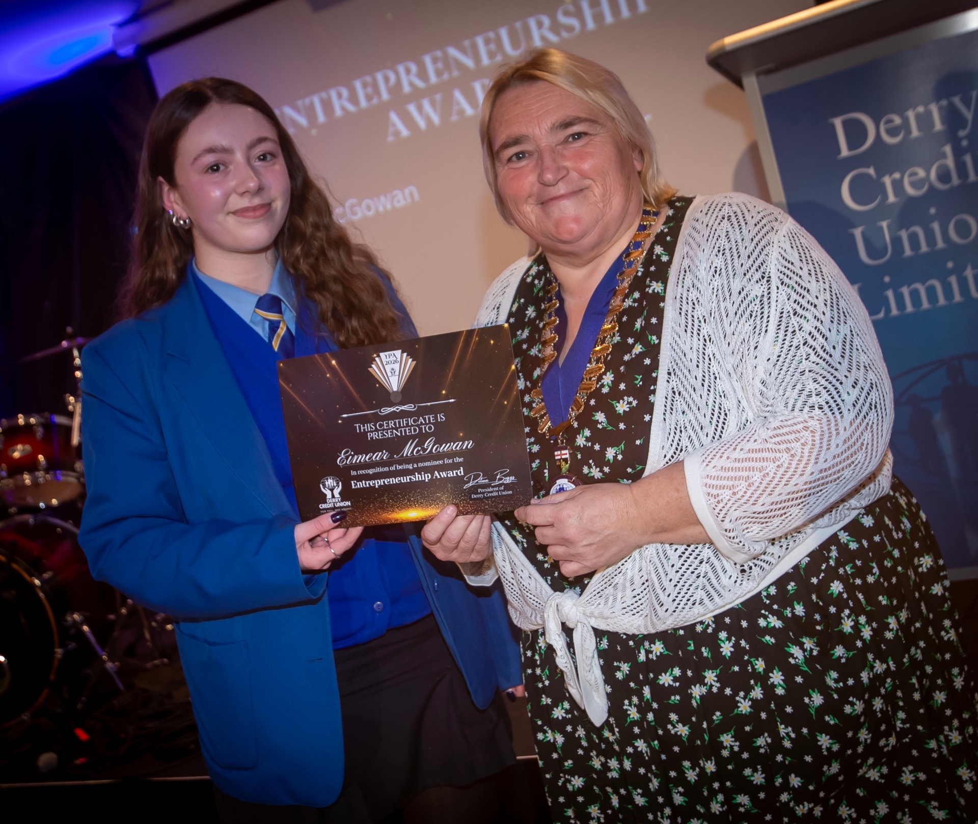 St. Mary's College student Eimear McGowan receiving her 'Entrepreneurship Award' certificate from Delma Boggs, President, Derry Credit Union.