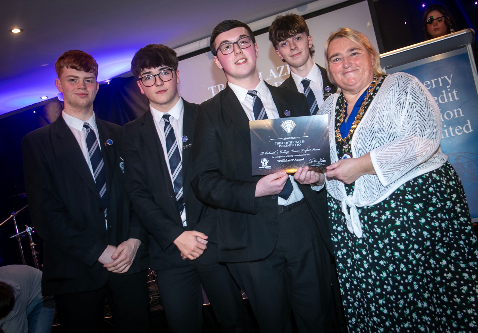St. Columb'si College students pictured receiving their 'Trailblazer Award' certificate from Delma Boggs, President, Derry Credit Union.