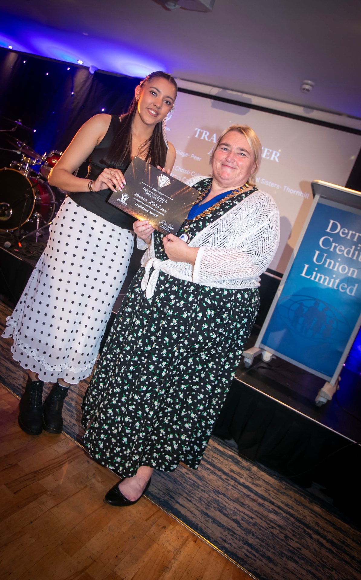 Ainara Hutcheson receiving the 'Trailblazer Award' certificate from Delma Boggs, President, Derry Credit Union. (Photos: Jim McCafferty Photography)