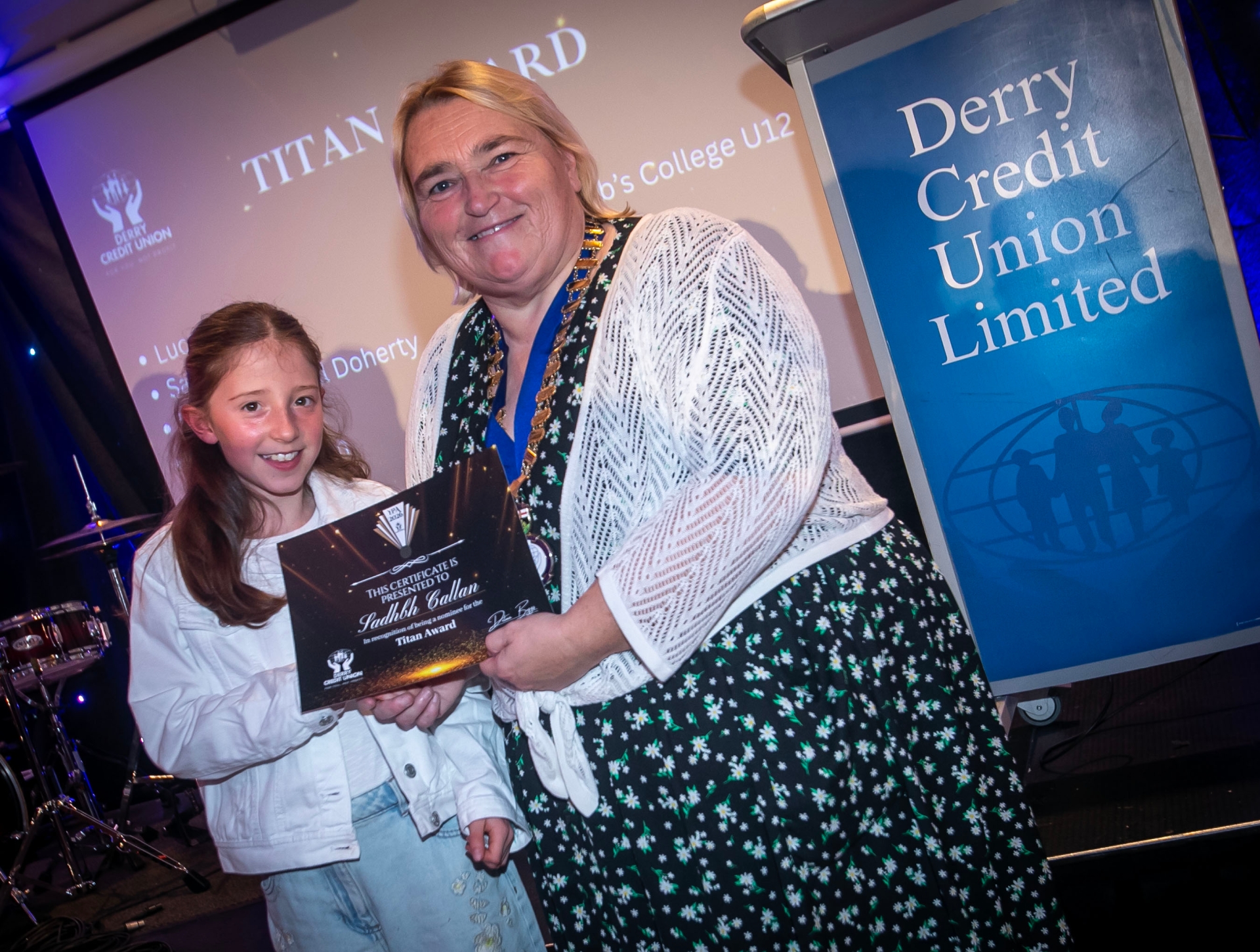 Sadhbh Callan receiving her 'Tital Award' certificate from Delma Boggs, President, Derry Credit Union on Monday night.