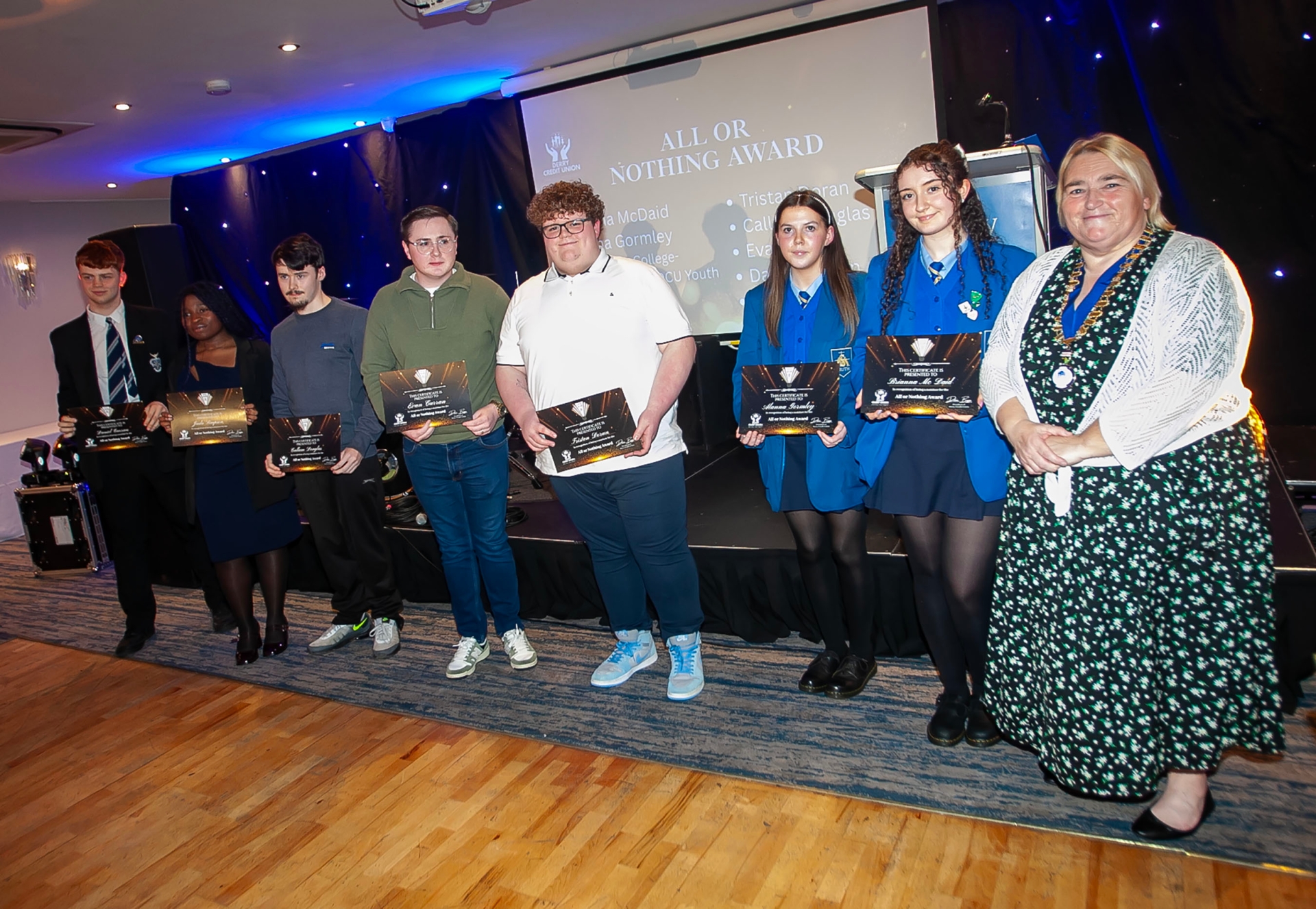 All Or Nothing Certificate recipients pictured with Delma Boggs, President, Derry Credit Union at Monday's Young Peoples Awards.