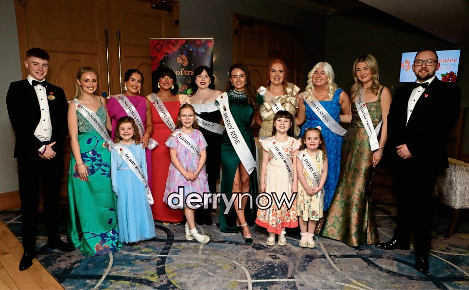 Group of contestants at the Derry Rose of Tralee selection held in the Everglades Hotel. On left is Aaron Tourish (escort) and on right Colton Friel (escort). (Photos - Tom Heaney, nwpresspics)