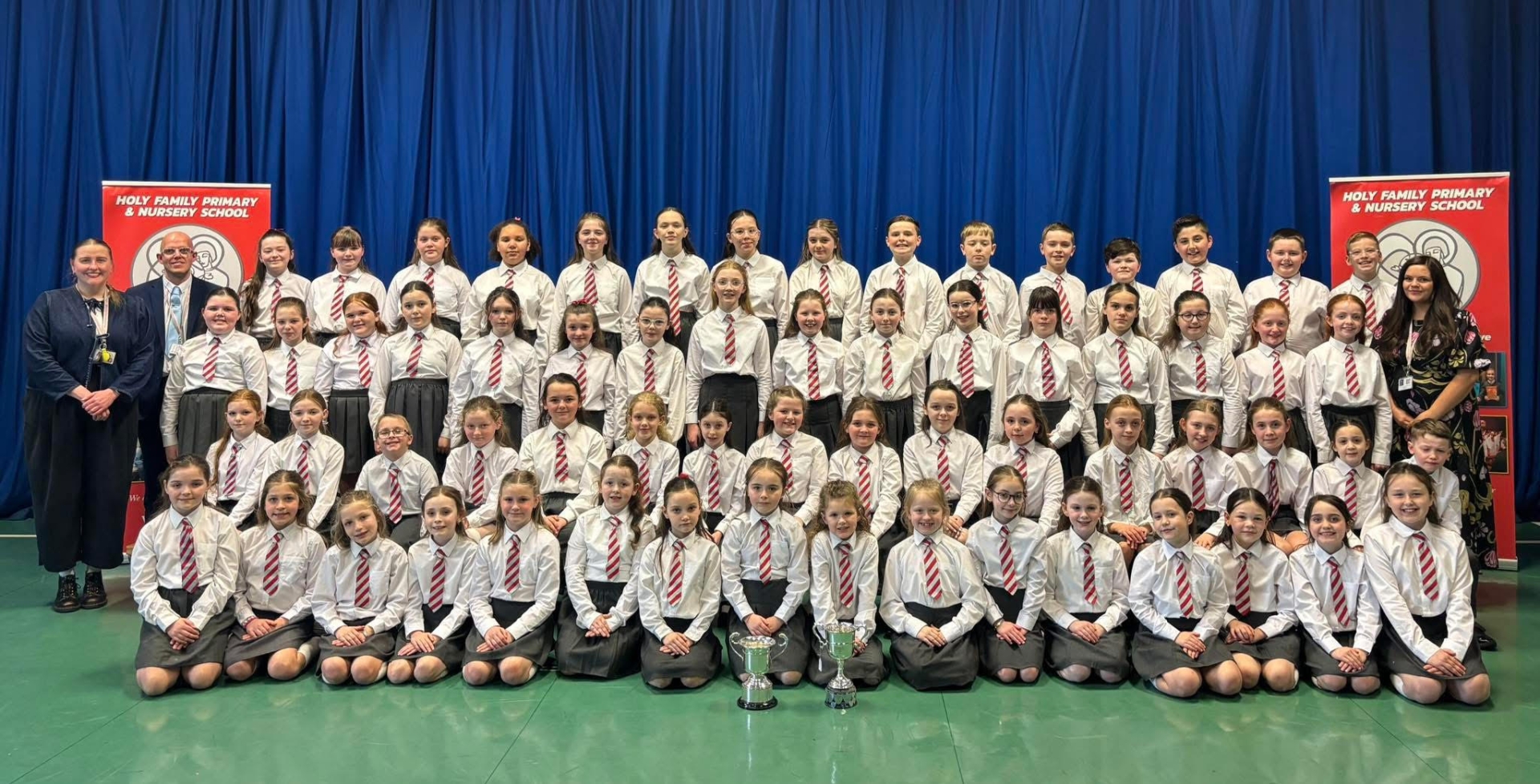 Holy Family Primary School pictured with their cups after winning the Unison Choirs and Two-Part Choir competitions at Derry Feis.