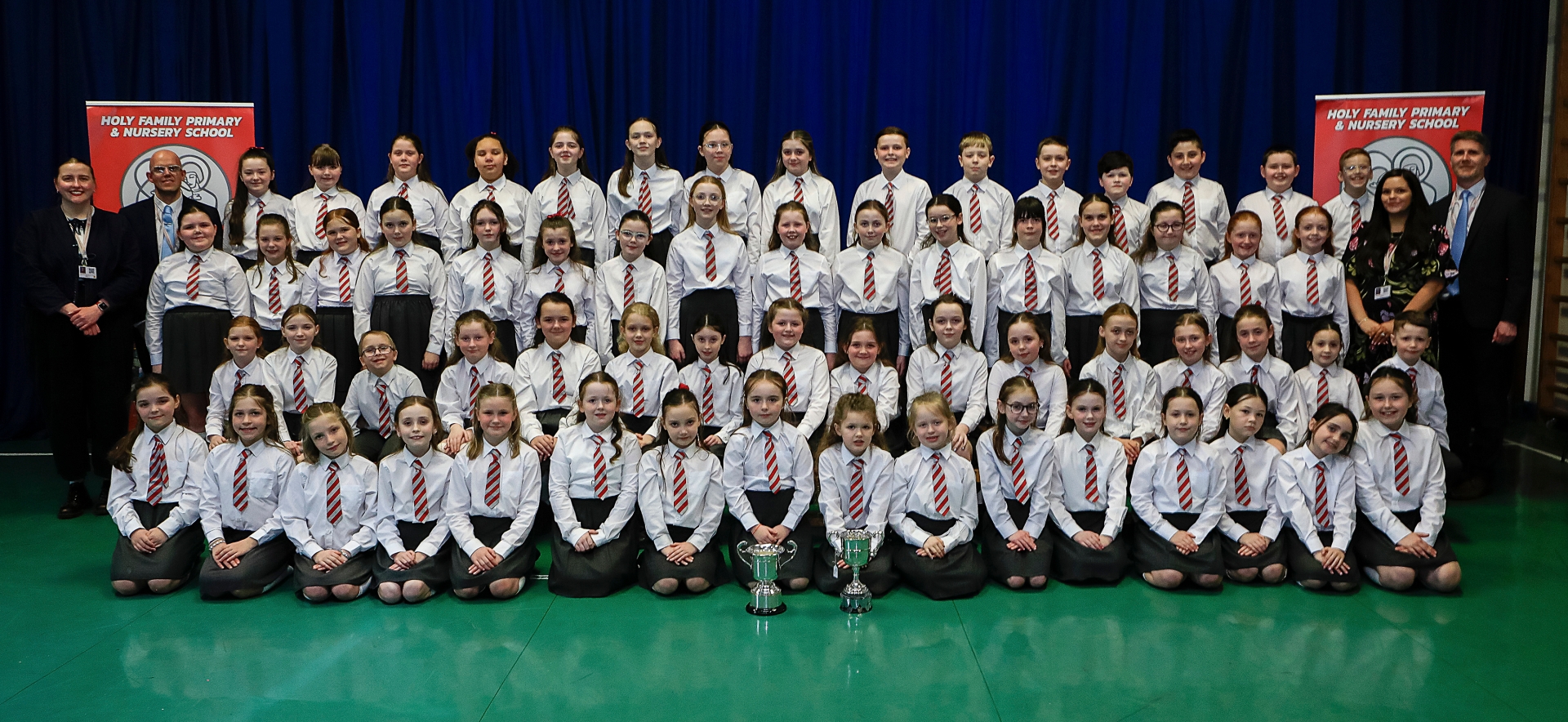 Holy Family PS choir winner of the Unison and Two-Part choir competitions at Feis Doire Cholmcille, held in Ardnashee School & College. Included on left, are Katie Herron, choir teacher, Patrick Gill, accompanist, and on right, Gavin Doherty, school principal and Lyndsay Barr, conductor. (Photo - Tom Heaney, nwpresspics)