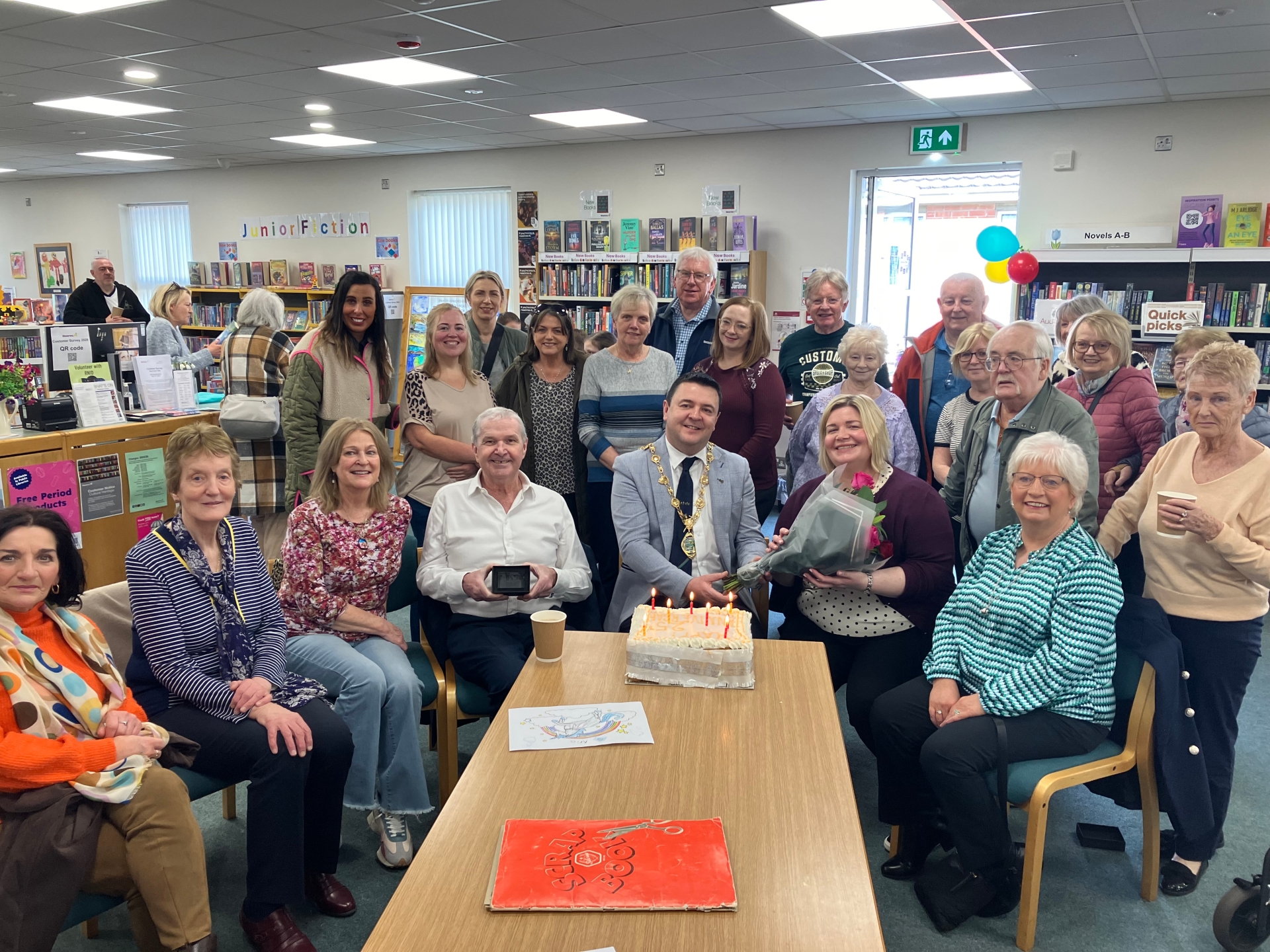 Mayor of Derry and Strabane Councillor Ruairi McHugh presenting a beautiful piece of Derry Crystal to Philip McLaughlin MBE and flowers to Julie Holmes Branch Library Manager. Also pictured are friends and customers of Strathfoyle Library.