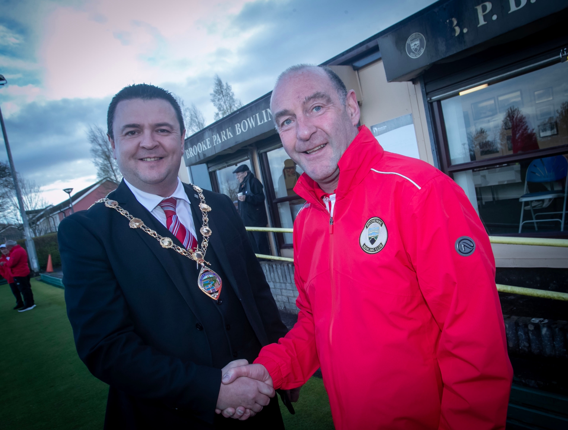 The President of Brooke Park Bowling Club, Kieran Logan welcoming the Mayor of Derry City and Strabane District Council, Ruairi McHugh to the club on Wednesday evening.