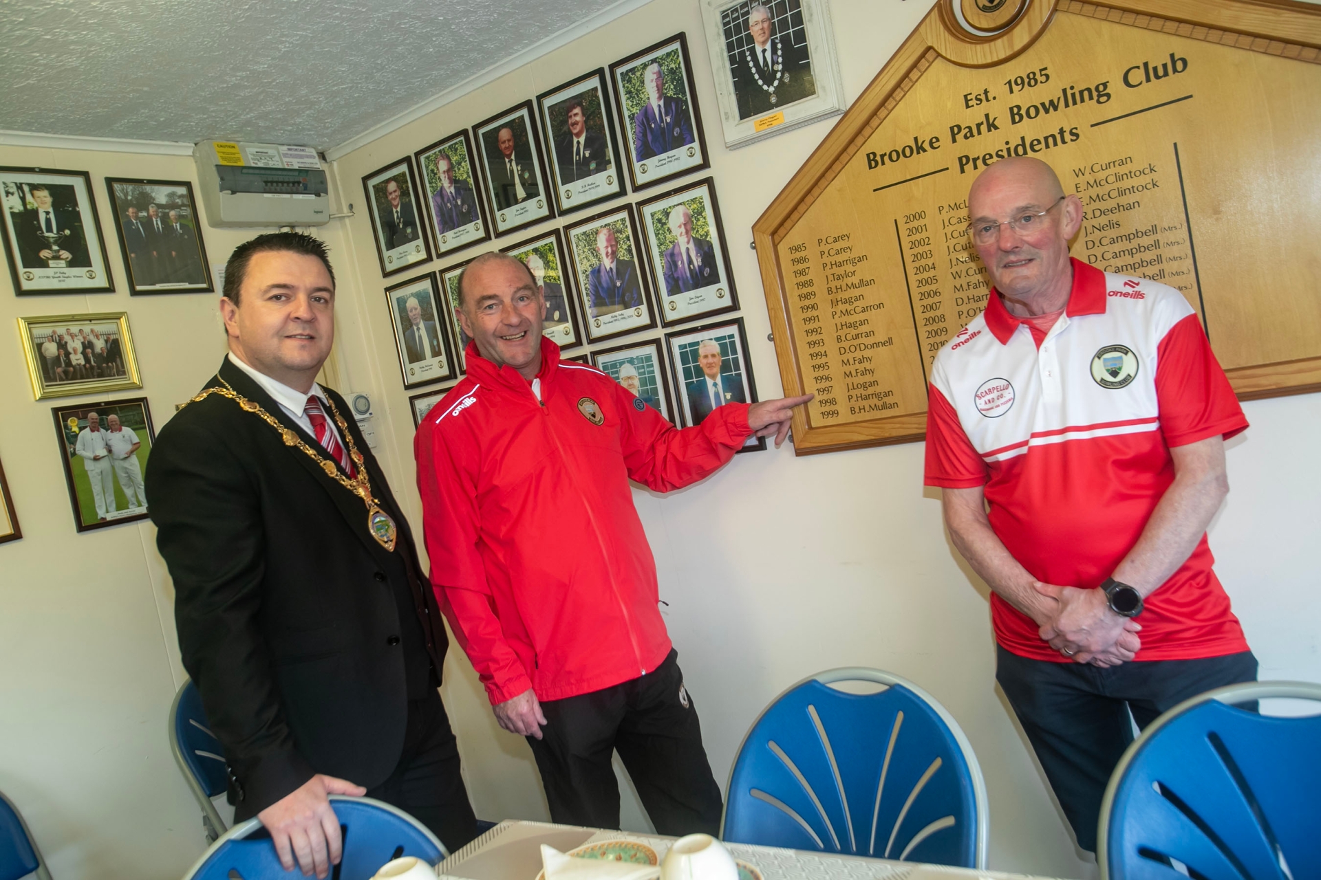 Brooke Park Bowling Club President Kieran Logan pointing out some of the past presidents of the club including his late father Jim to the Mayor, Ruairi McHugh during his visit on Wednesday evening. Included on right is Raymond Wray, Vice President.