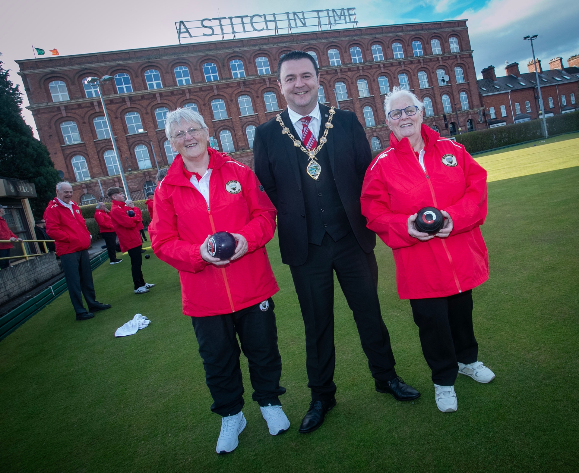 Mayor McHugh pictured with the club's only two lady players, Theresa Black and Dorothy Campbell, during Wednesday evening's visit to the Rosemount club.
