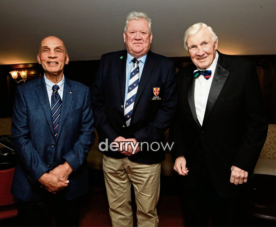 Stan Huey, Past President Ulster Brancy IRFU, with from left, Charlie Chada, Past Captain, CDRFC, and John King, President of Ulster Society of Referees.