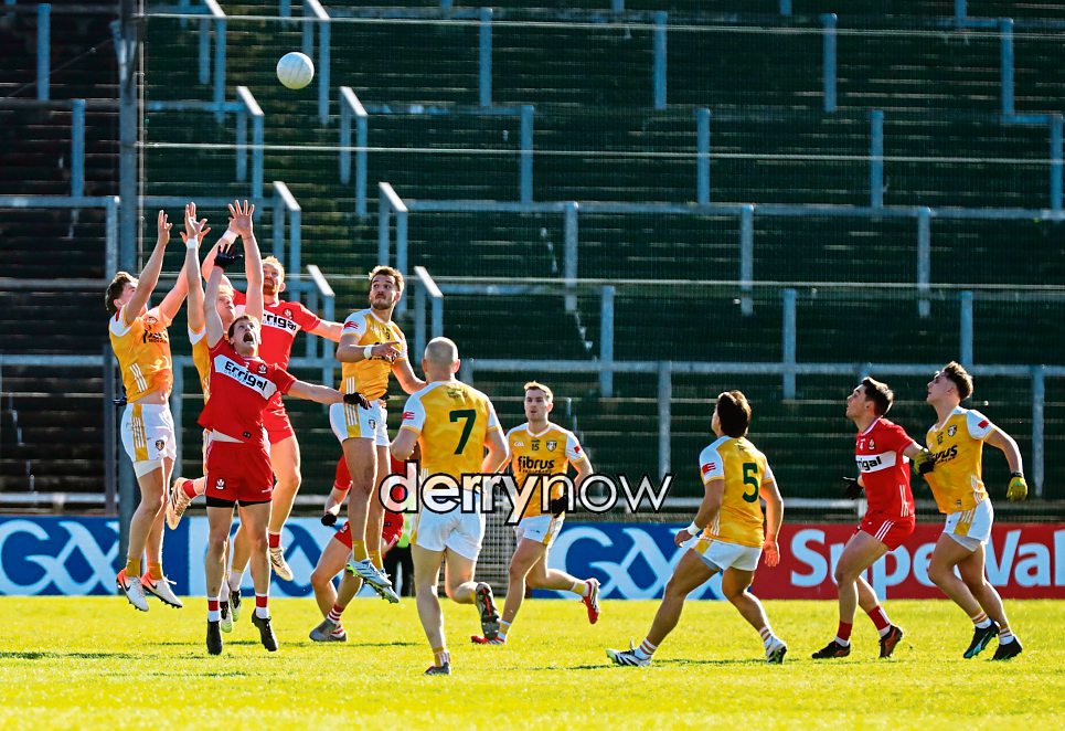 Derry and Antrim players battle for possession.