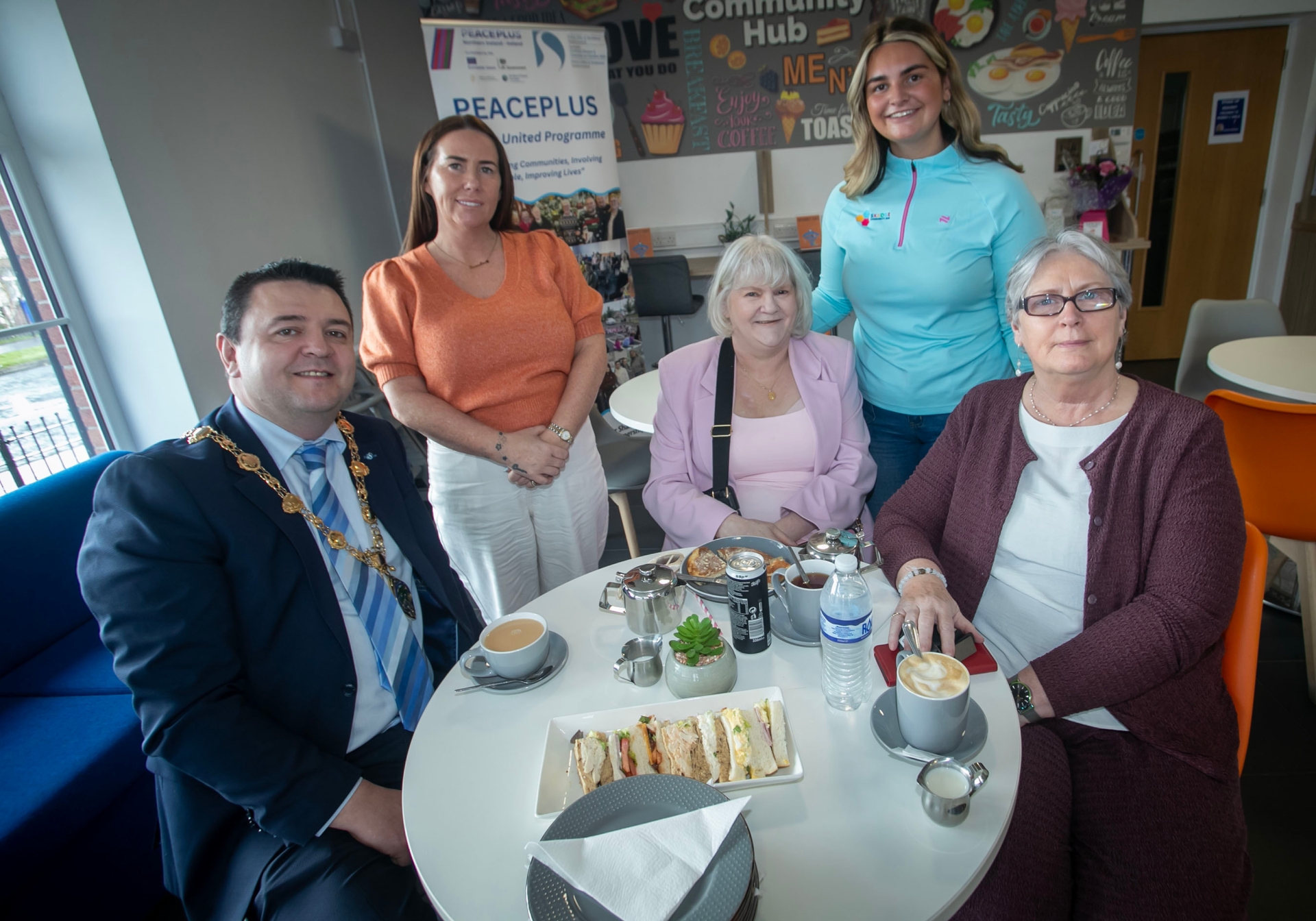 Mayor McHugh having some refreshments at Friday's event with, from left, Nicola Mullan, Skeoge Hub Co-Ordinator, Mandy Smith, Mollie McMonagle, Programme Officer, Skeoge United, and Eilis Gill. (Photos: Jim McCafferty Photography)