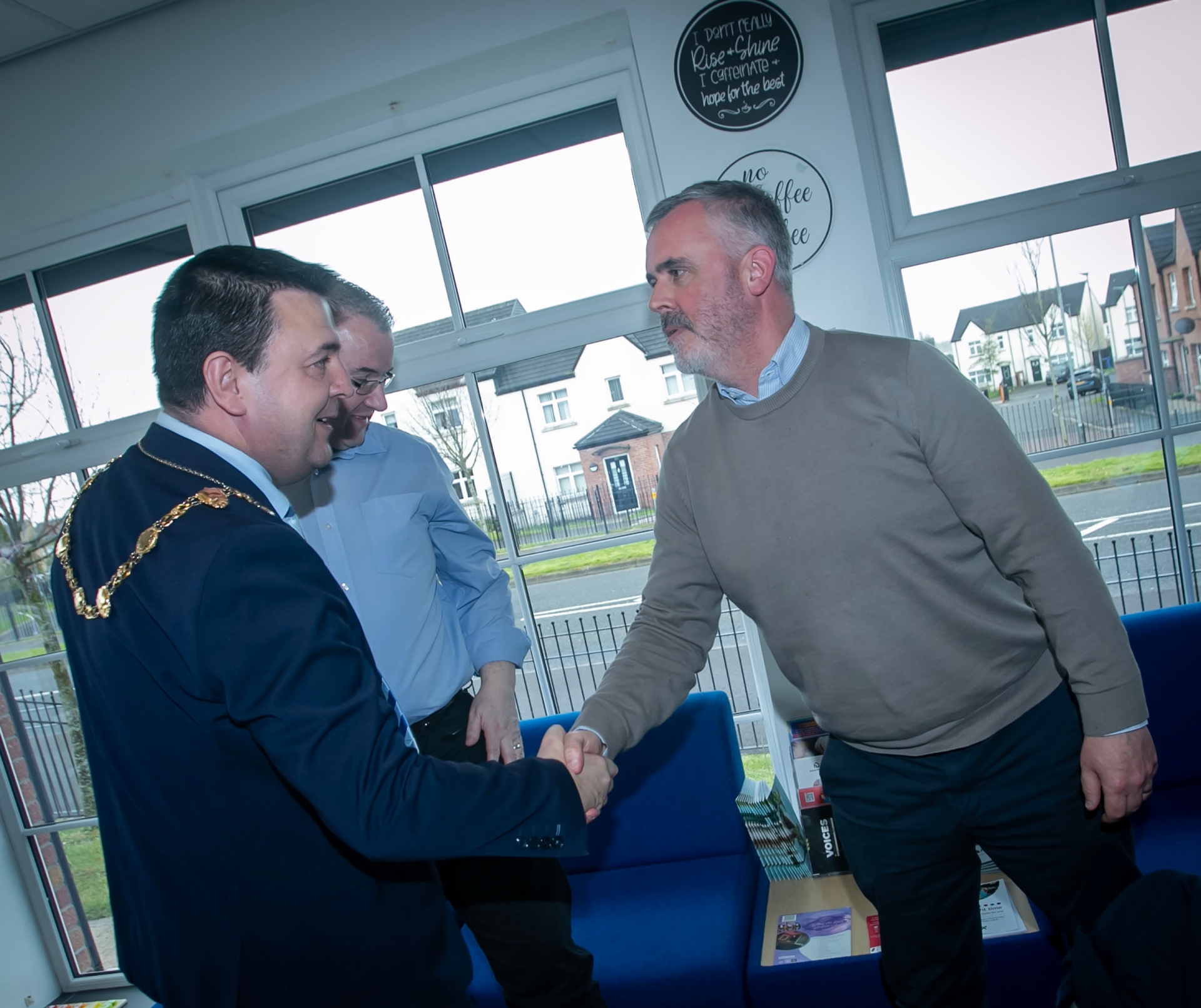 Greater Shantallow Area Partnership manager Rory McParland welcoming the Mayor, Ruairi McHugh to the Skeoge Hub on Friday. Included is Darren Kirby (Centre.).