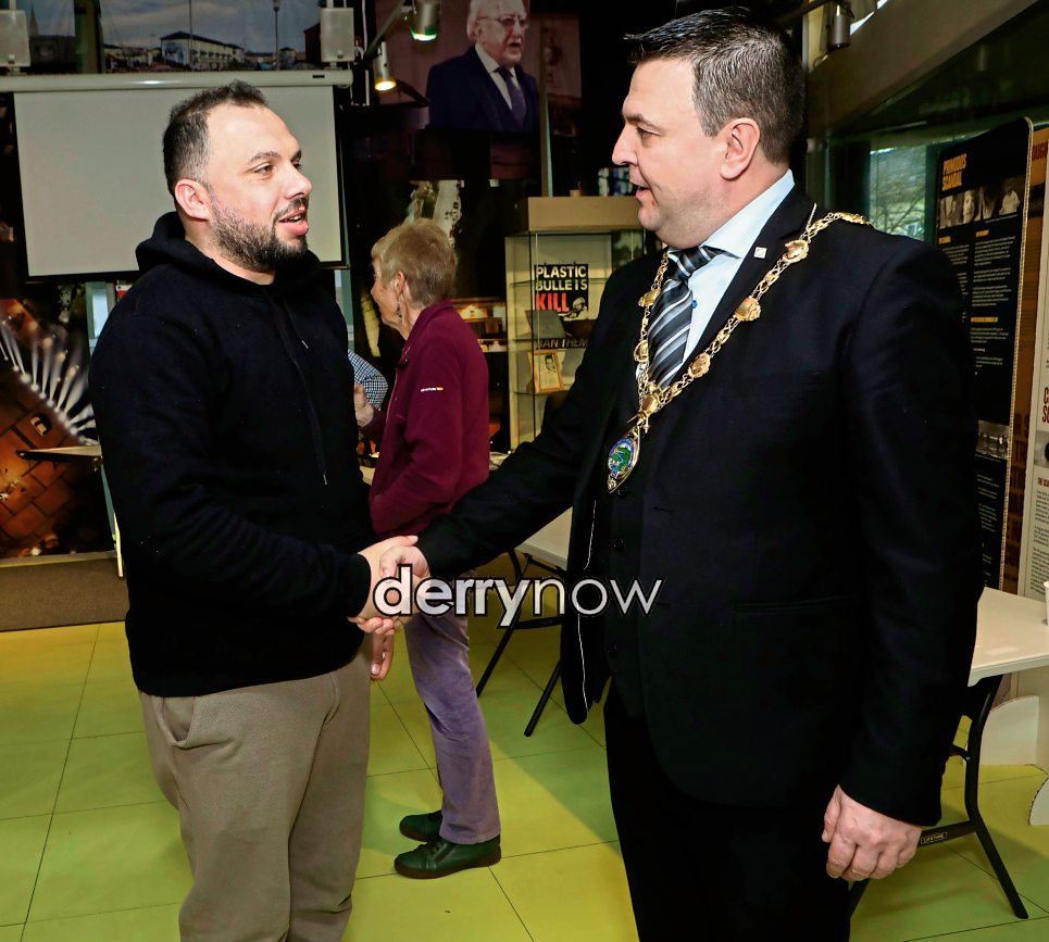 Mayor Ruairí McHugh greets Gaza born, Yousef Ajamal on his arrival at the Museum of Free Derry on Tuesday. (Photos - Tom Heaney, nwpresspics)