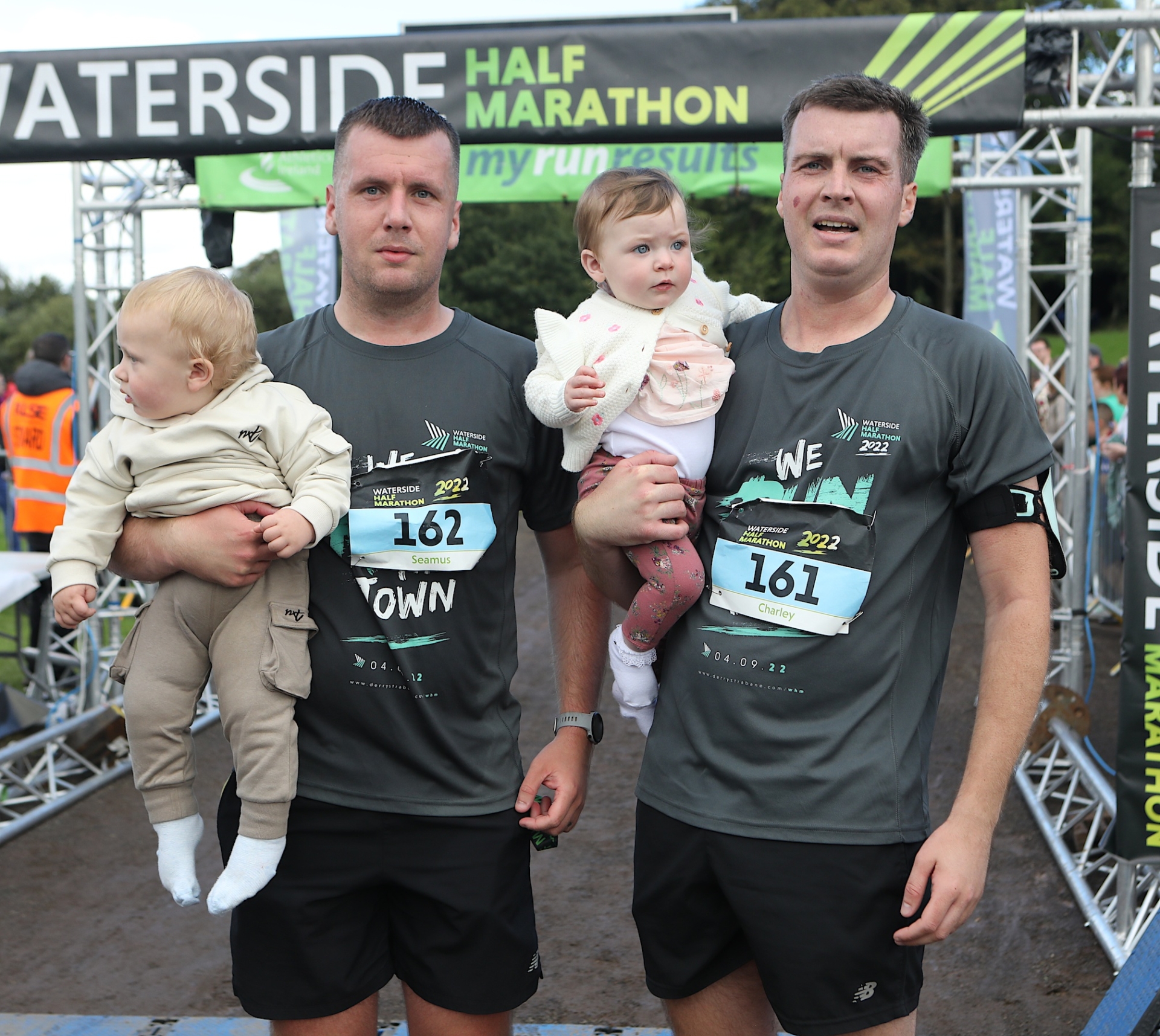 Seamus and Charley Cusack with their babies at the finish line.