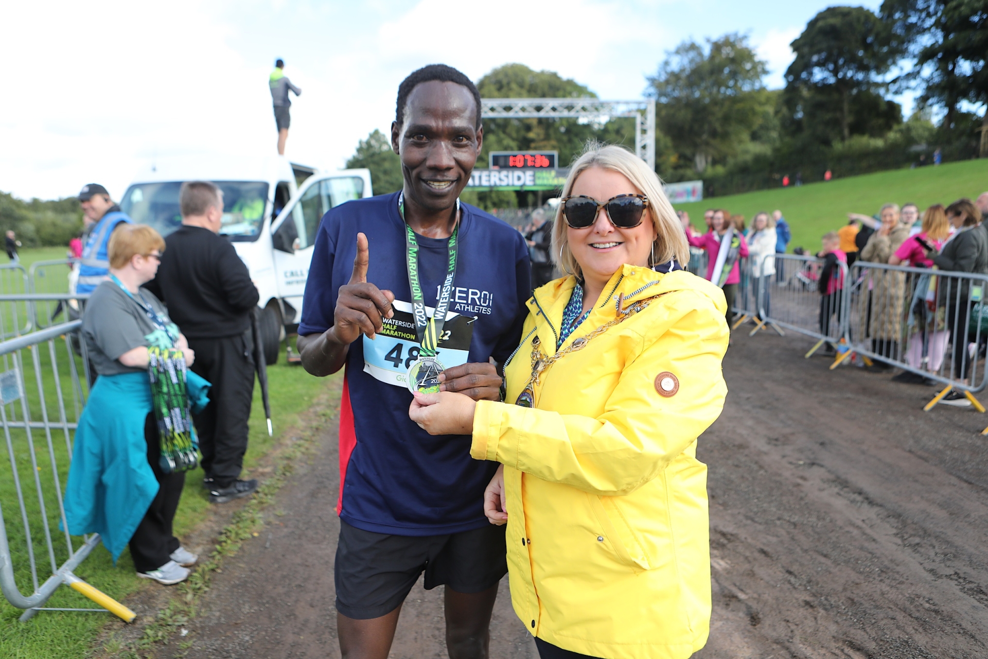 Mayor Sandra Duffy with Gideon Kimosop, winner of the Waterside Half Marathon 2022.