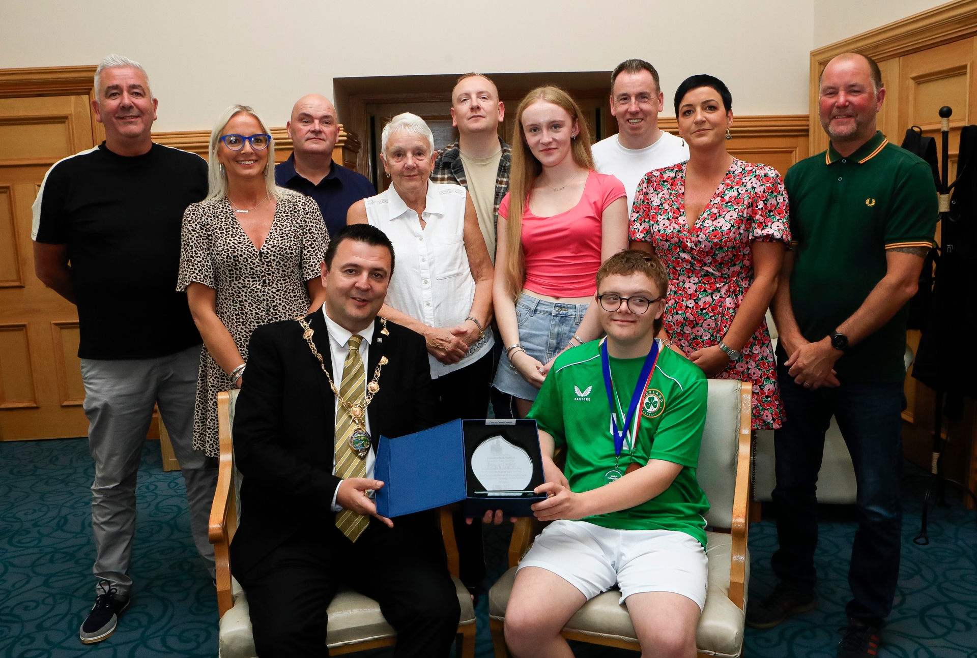 Mayor Ruairí McHugh presents a commemorative plaque to Keigan Taylor. Included are family and friends.